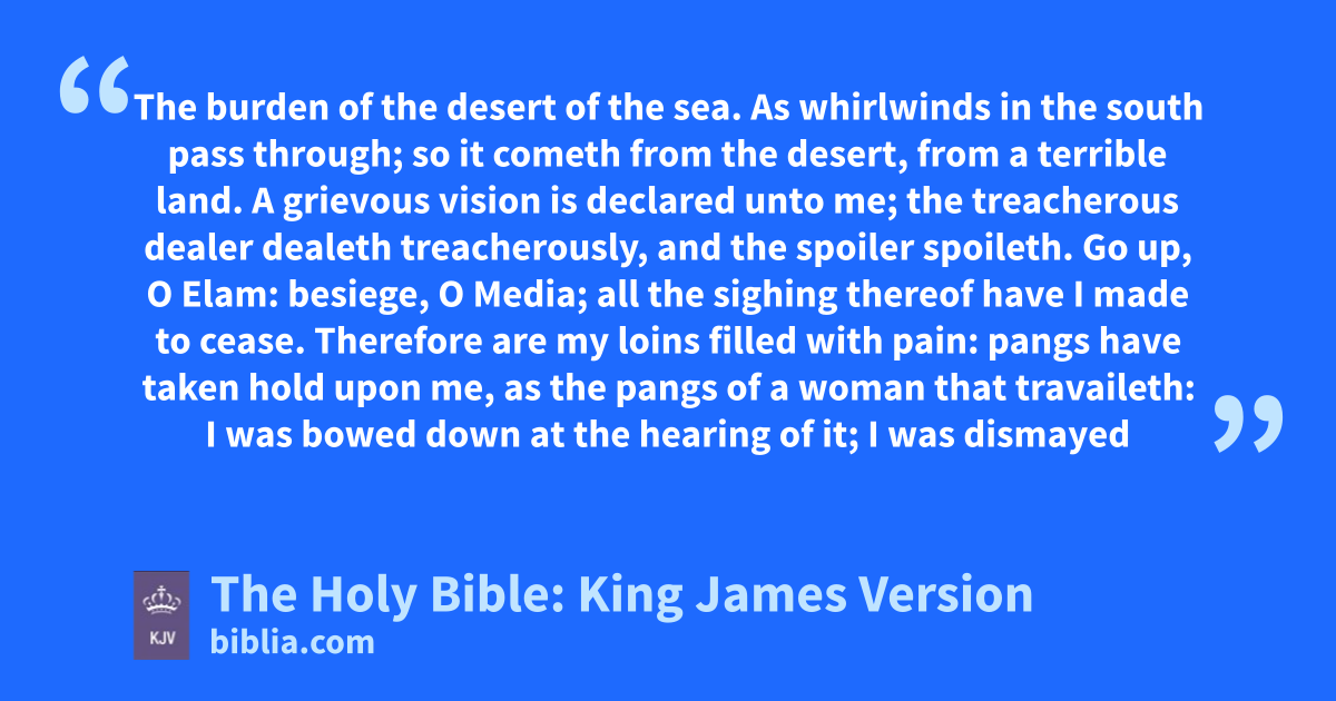 1 The burden of the desert of the sea. As whirlwinds in the south pass through; so it cometh from the desert, from a terrible land. 2 A grievousa vision is declared unto me; the treacherous dealer dealeth treacherously, and the spoiler spoileth. Go up, O Elam: besiege, O Media; all the sighing thereof have I made to cease. 3 Therefore are my loins filled with pain: pangs have taken hold upon me, as the pangs of a woman that travaileth: I was bowed down at the hearing of it; I was dismayed at the seeing of it. 4 My heartb panted, fearfulness affrighted me: the night of my pleasure hath he turned into fear unto me. 5 Prepare the table, watch in the watchtower, eat, drink: arise, ye princes, and anoint the shield. 6 For thus hath the Lord said unto me, Go, set a watchman, let him declare what he seeth. 7 And he saw a chariot with a couple of horsemen, a chariot of asses, and a chariot of camels; and he hearkened diligently with much heed: 8 And he cried, A lion: My lord, I stand continually upon the watchtower in the daytime, and I am set in my ward whole nights: 9 And, behold, here cometh a chariot of men, with a couple of horsemen. And he answered and said, Babylon is fallen, is fallen; and all the graven images of her gods he hath broken unto the ground. 10 O my threshing, and the cornc of my floor: that which I have heard of the LORD of hosts, the God of Israel, have I declared unto you.