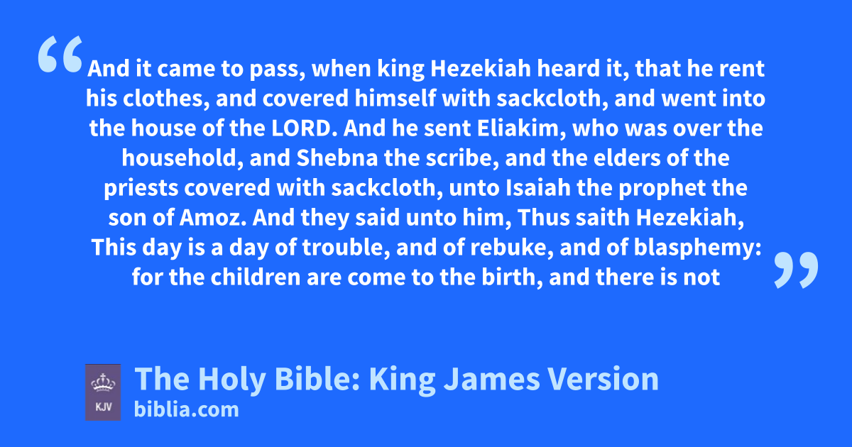 1 And it came to pass, when king Hezekiah heard it, that he rent his clothes, and covered himself with sackcloth, and went into the house of the LORD. 2 And he sent Eliakim, who was over the household, and Shebna the scribe, and the elders of the priests covered with sackcloth, unto Isaiah the prophet the son of Amoz. 3 And they said unto him, Thus saith Hezekiah, This day is a day of trouble, and of rebuke, and of blasphemya: for the children are come to the birth, and there is not strength to bring forth. 4 It may be the LORD thy God will hear the words of Rabshakeh, whom the king of Assyria his master hath sent to reproach the living God, and will reprove the words which the LORD thy God hath heard: wherefore lift up thy prayer for the remnant that is leftb. 5 So the servants of king Hezekiah came to Isaiah. 6 And Isaiah said unto them, Thus shall ye say unto your master, Thus saith the LORD, Be not afraid of the words that thou hast heard, wherewith the servants of the king of Assyria have blasphemed me. 7 Behold, I will sendc a blast upon him, and he shall hear a rumour, and return to his own land; and I will cause him to fall by the sword in his own land.