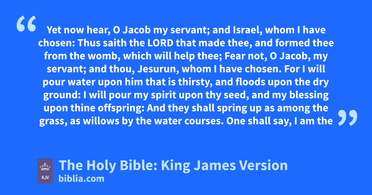 1 Yet now hear, O Jacob my servant; and Israel, whom I have chosen: 2 Thus saith the LORD that made thee, and formed thee from the womb, which will help thee; Fear not, O Jacob, my servant; and thou, Jesurun, whom I have chosen. 3 For I will pour water upon him that is thirsty, and floods upon the dry ground: I will pour my spirit upon thy seed, and my blessing upon thine offspring: 4 And they shall spring up as among the grass, as willows by the water courses. 5 One shall say, I am the LORD’S; and another shall call himself by the name of Jacob; and another shall subscribe with his hand unto the LORD, and surname himself by the name of Israel. 6 Thus saith the LORD the King of Israel, and his redeemer the LORD of hosts; I am the first, and I am the last; and beside me there is no God. 7 And who, as I, shall call, and shall declare it, and set it in order for me, since I appointed the ancient people? and the things that are coming, and shall come, let them shew unto them. 8 Fear ye not, neither be afraid: have not I told thee from that time, and have declared it? ye are even my witnesses. Is there a God beside me? yea, there is no Goda; I know not any.