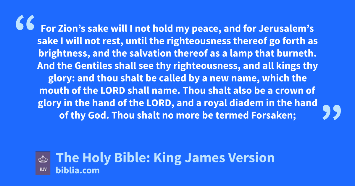 1 For Zion’s sake will I not hold my peace, and for Jerusalem’s sake I will not rest, until the righteousness thereof go forth as brightness, and the salvation thereof as a lamp that burneth. 2 And the Gentiles shall see thy righteousness, and all kings thy glory: and thou shalt be called by a new name, which the mouth of the LORD shall name. 3 Thou shalt also be a crown of glory in the hand of the LORD, and a royal diadem in the hand of thy God. 4 Thou shalt no more be termed Forsaken; neither shall thy land any more be termed Desolate: but thou shalt be called Hephzibaha, and thy land Beulah: for the LORD delighteth in thee, and thy land shall be married. 5 For as a young man marrieth a virgin, so shall thy sons marry thee: and as the bridegroom rejoiceth over the bride, so shall thy God rejoice over thee.