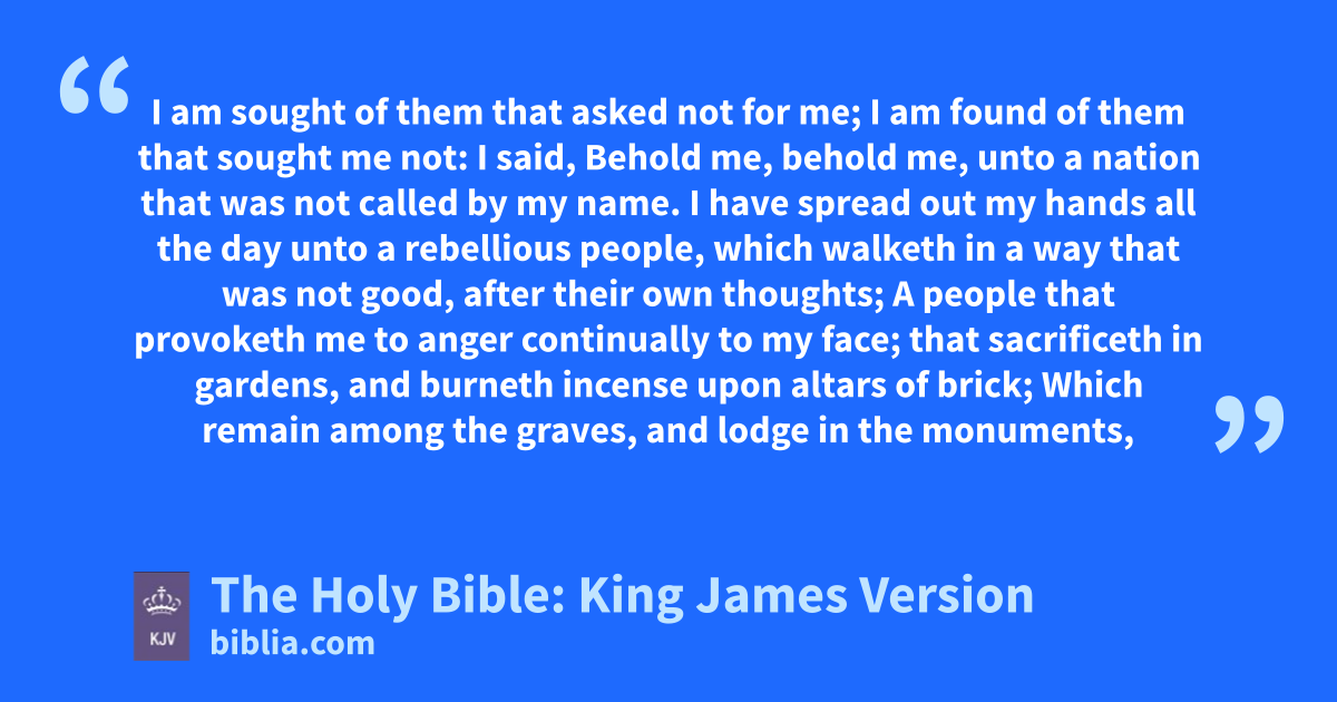 1 I am sought of them that asked not for me; I am found of them that sought me not: I said, Behold me, behold me, unto a nation that was not called by my name. 2 I have spread out my hands all the day unto a rebellious people, which walketh in a way that was not good, after their own thoughts; 3 A people that provoketh me to anger continually to my face; that sacrificeth in gardens, and burneth incense upon altars of brick; 4 Which remain among the graves, and lodge in the monuments, which eat swine’s flesh, and brotha of abominable things is in their vessels; 5 Which say, Stand by thyself, come not near to me; for I am holier than thou. These are a smoke in my noseb, a fire that burneth all the day. 6 Behold, it is written before me: I will not keep silence, but will recompense, even recompense into their bosom, 7 Your iniquities, and the iniquities of your fathers together, saith the LORD, which have burned incense upon the mountains, and blasphemed me upon the hills: therefore will I measure their former work into their bosom.