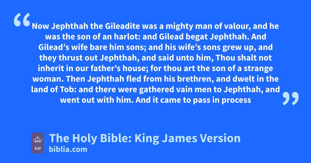 1 Now Jephthaha the Gileadite was a mighty man of valour, and he was the son of an harlot: and Gilead begat Jephthah. 2 And Gilead’s wife bare him sons; and his wife’s sons grew up, and they thrust out Jephthah, and said unto him, Thou shalt not inherit in our father’s house; for thou art the son of a strange woman. 3 Then Jephthah fled fromb his brethren, and dwelt in the land of Tob: and there were gathered vain men to Jephthah, and went out with him.