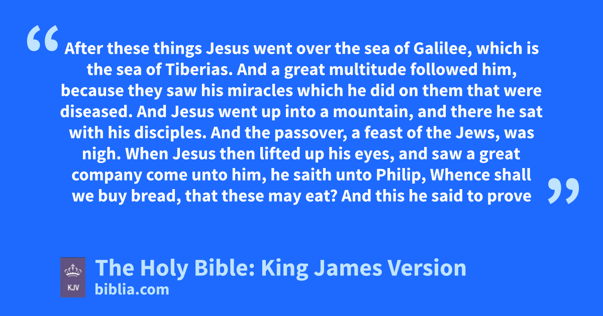 1 After these things Jesus went over the sea of Galilee, which is the sea of Tiberias. 2 And a great multitude followed him, because they saw his miracles which he did on them that were diseased. 3 And Jesus went up into a mountain, and there he sat with his disciples. 4 And the passover, a feast of the Jews, was nigh. 5 When Jesus then lifted up his eyes, and saw a great company come unto him, he saith unto Philip, Whence shall we buy bread, that these may eat? 6 And this he said to prove him: for he himself knew what he would do. 7 Philip answered him, Two hundred pennyworth of bread is not sufficient for them, that every one of them may take a little. 8 One of his disciples, Andrew, Simon Peter’s brother, saith unto him, 9 There is a lad here, which hath five barley loaves, and two small fishes: but what are they among so many? 10 And Jesus said, Make the men sit down. Now there was much grass in the place. So the men sat down, in number about five thousand. 11 And Jesus took the loaves; and when he had given thanks, he distributed to the disciples, and the disciples to them that were set down; and likewise of the fishes as much as they would. 12 When they were filled, he said unto his disciples, Gather up the fragments that remain, that nothing be lost. 13 Therefore they gathered them together, and filled twelve baskets with the fragments of the five barley loaves, which remained over and above unto them that had eaten. 14 Then those men, when they had seen the miracle that Jesus did, said, This is of a truth that prophet that should come into the world.
