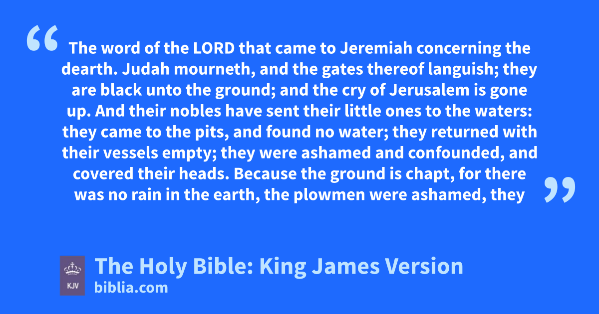 1 The word of the LORD that came to Jeremiah concerning the deartha. 2 Judah mourneth, and the gates thereof languish; they are black unto the ground; and the cry of Jerusalem is gone up. 3 And their nobles have sent their little ones to the waters: they came to the pits, and found no water; they returned with their vessels empty; they were ashamed and confounded, and covered their heads. 4 Because the ground is chapt, for there was no rain in the earth, the plowmen were ashamed, they covered their heads. 5 Yea, the hind also calved in the field, and forsook it, because there was no grass. 6 And the wild asses did stand in the high places, they snuffed up the wind like dragons; their eyes did fail, because there was no grass. 7 O LORD, though our iniquities testify against us, do thou it for thy name’s sake: for our backslidings are many; we have sinned against thee. 8 O the hope of Israel, the saviour thereof in time of trouble, why shouldest thou be as a stranger in the land, and as a wayfaring man that turneth aside to tarry for a night? 9 Why shouldest thou be as a man astonied, as a mighty man that cannot save? yet thou, O LORD, art in the midst of us, and we are called by thy name; leave us not.