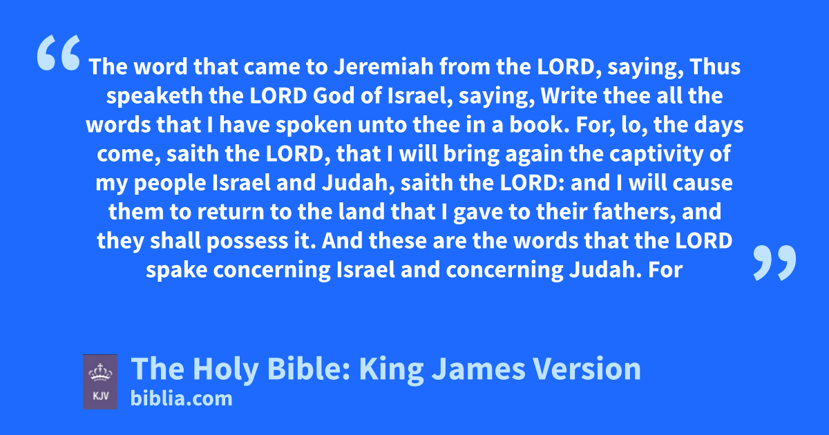 1 The word that came to Jeremiah from the LORD, saying, 2 Thus speaketh the LORD God of Israel, saying, Write thee all the words that I have spoken unto thee in a book. 3 For, lo, the days come, saith the LORD, that I will bring again the captivity of my people Israel and Judah, saith the LORD: and I will cause them to return to the land that I gave to their fathers, and they shall possess it. 4 And these are the words that the LORD spake concerning Israel and concerning Judah. 5 For thus saith the LORD; We have heard a voice of trembling, of feara, and not of peace. 6 Ask ye now, and see whether a manb doth travail with child? wherefore do I see every man with his hands on his loins, as a woman in travail, and all faces are turned into paleness? 7 Alas! for that day is great, so that none is like it: it is even the time of Jacob’s trouble; but he shall be saved out of it. 8 For it shall come to pass in that day, saith the LORD of hosts, that I will break his yoke from off thy neck, and will burst thy bonds, and strangers shall no more serve themselves of him: 9 But they shall serve the LORD their God, and David their king, whom I will raise up unto them.