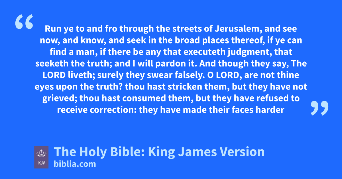 1 Run ye to and fro through the streets of Jerusalem, and see now, and know, and seek in the broad places thereof, if ye can find a man, if there be any that executeth judgment, that seeketh the truth; and I will pardon it. 2 And though they say, The LORD liveth; surely they swear falsely. 3 O LORD, are not thine eyes upon the truth? thou hast stricken them, but they have not grieved; thou hast consumed them, but they have refused to receive correction: they have made their faces harder than a rock; they have refused to return. 4 Therefore I said, Surely these are poor; they are foolish: for they know not the way of the LORD, nor the judgment of their God. 5 I will get me unto the great men, and will speak unto them; for they have known the way of the LORD, and the judgment of their God: but these have altogether broken the yoke, and burst the bonds. 6 Wherefore a lion out of the forest shall slay them, and a wolf of the eveningsa shall spoil them, a leopard shall watch over their cities: every one that goeth out thence shall be torn in pieces: because their transgressions are many, and their backslidings are increased. 7 How shall I pardon thee for this? thy children have forsaken me, and sworn by them that are no gods: when I had fed them to the full, they then committed adultery, and assembled themselves by troops in the harlots’ houses. 8 They were as fed horses in the morning: every one neighed after his neighbour’s wife. 9 Shall I not visit for these things? saith the LORD: and shall not my soul be avenged on such a nation as this?