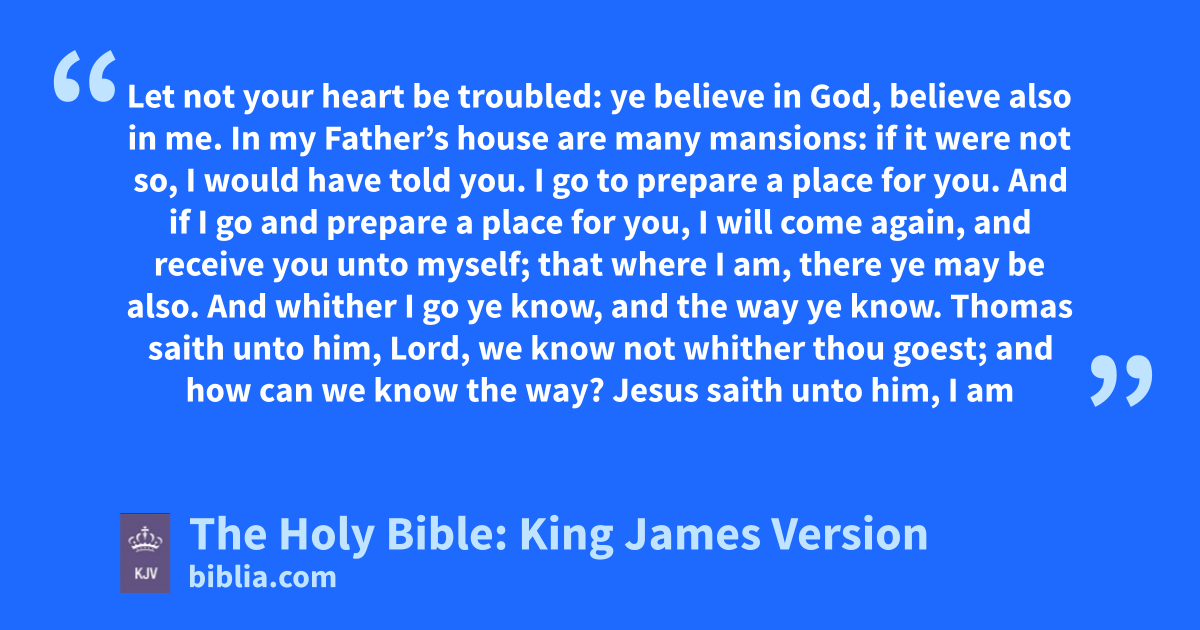 1 Let not your heart be troubled: ye believe in God, believe also in me. 2 In my Father’s house are many mansions: if it were not so, I would have told you. I go to prepare a place for you. 3 And if I go and prepare a place for you, I will come again, and receive you unto myself; that where I am, there ye may be also.