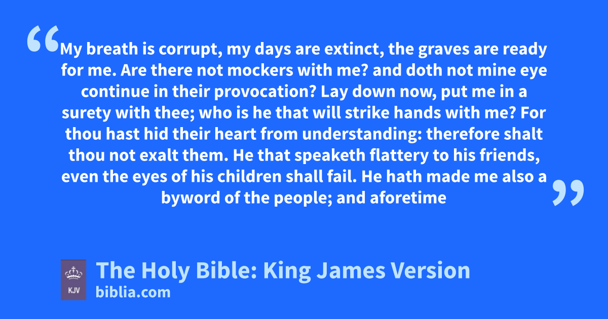 1 My breatha is corrupt, my days are extinct, the graves are ready for me. 2 Are there not mockers with me? and doth not mine eye continueb in their provocation? 3 Lay down now, put me in a surety with thee; who is he that will strike hands with me? 4 For thou hast hid their heart from understanding: therefore shalt thou not exalt them. 5 He that speaketh flattery to his friends, even the eyes of his children shall fail. 6 He hath made me also a byword of the people; and aforetimec I was as a tabret. 7 Mine eye also is dim by reason of sorrow, and all my membersd are as a shadow. 8 Upright men shall be astonied at this, and the innocent shall stir up himself against the hypocrite. 9 The righteous also shall hold on his way, and he that hath clean hands shall bee stronger and stronger.