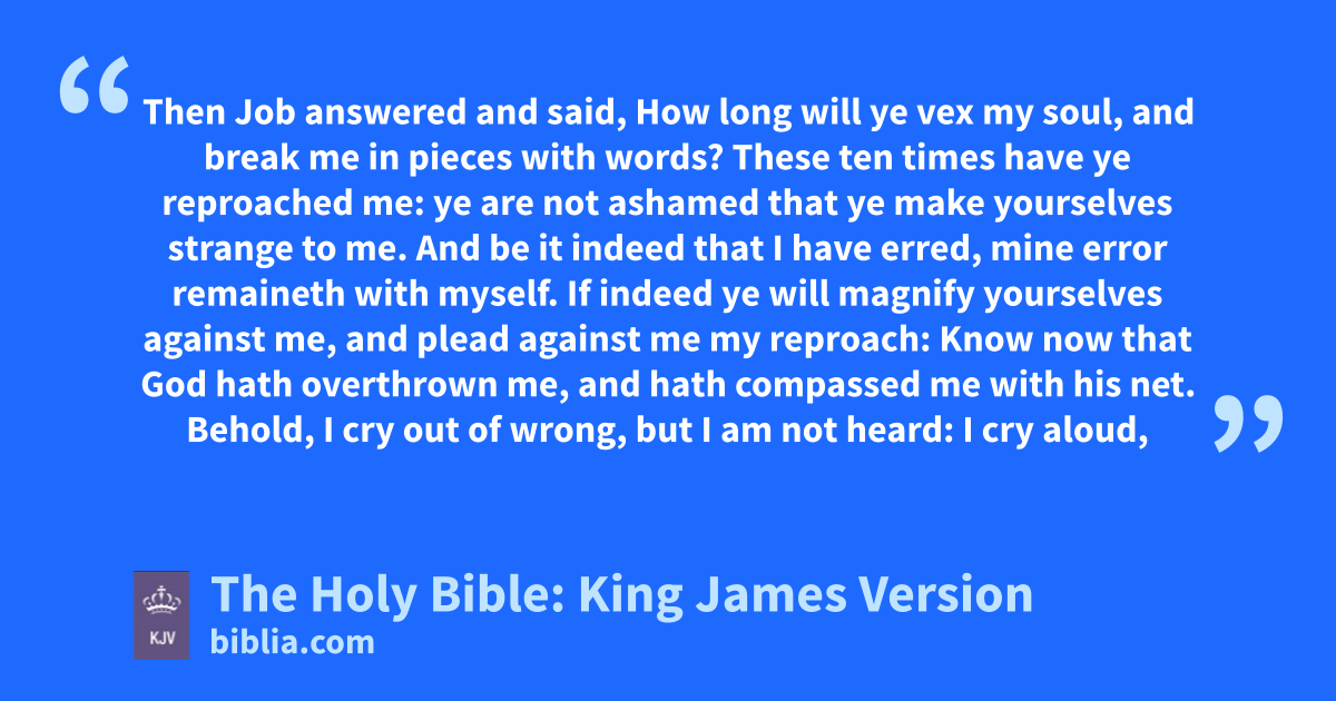1 Then Job answered and said, 2 How long will ye vex my soul, and break me in pieces with words? 3 These ten times have ye reproached me: ye are not ashamed that ye make yourselves strange to me. 4 And be it indeed that I have erred, mine error remaineth with myself. 5 If indeed ye will magnify yourselves against me, and plead against me my reproach: 6 Know now that God hath overthrown me, and hath compassed me with his net. 7 Behold, I cry out of wronga, but I am not heard: I cry aloud, but there is no judgment.