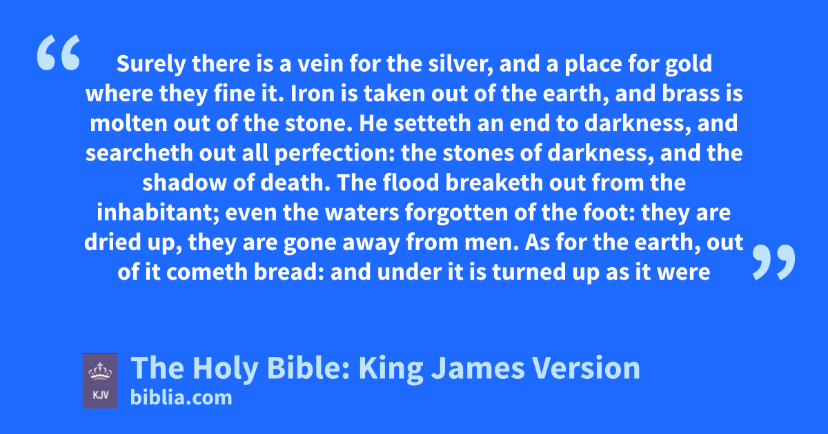 1 Surely there is a veina for the silver, and a place for gold where they fine it. 2 Iron is taken out of the earthb, and brass is molten out of the stone. 3 He setteth an end to darkness, and searcheth out all perfection: the stones of darkness, and the shadow of death. 4 The flood breaketh out from the inhabitant; even the waters forgotten of the foot: they are dried up, they are gone away from men. 5 As for the earth, out of it cometh bread: and under it is turned up as it were fire. 6 The stones of it are the place of sapphires: and it hath dustc of gold. 7 There is a path which no fowl knoweth, and which the vulture’s eye hath not seen: 8 The lion’s whelps have not trodden it, nor the fierce lion passed by it. 9 He putteth forth his hand upon the rockd; he overturneth the mountains by the roots. 10 He cutteth out rivers among the rocks; and his eye seeth every precious thing. 11 He bindeth the floods from overflowinge; and the thing that is hid bringeth he forth to light. 12 But where shall wisdom be found? and where is the place of understanding? 13 Man knoweth not the price thereof; neither is it found in the land of the living.