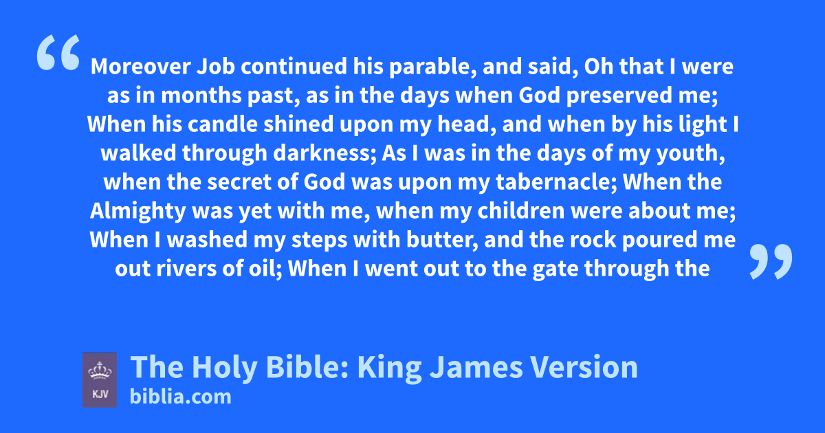 1 Moreover Job continueda his parable, and said, 2 Oh that I were as in months past, as in the days when God preserved me; 3 When his candleb shined upon my head, and when by his light I walked through darkness; 4 As I was in the days of my youth, when the secret of God was upon my tabernacle; 5 When the Almighty was yet with me, when my children were about me; 6 When I washed my steps with butter, and the rock poured me out rivers of oil;