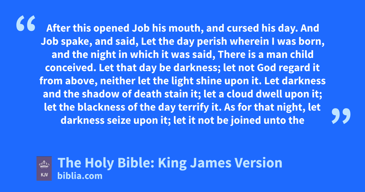 1 After this opened Job his mouth, and cursed his day. 2 And Job spakea, and said, 3 Let the day perish wherein I was born, and the night in which it was said, There is a man child conceived. 4 Let that day be darkness; let not God regard it from above, neither let the light shine upon it. 5 Let darkness and the shadow of death stainb it; let a cloud dwell upon it; let the blackness of the day terrify it. 6 As for that night, let darkness seize upon it; let it not be joined unto the days of the year, let it not come into the number of the months. 7 Lo, let that night be solitary, let no joyful voice come therein. 8 Let them curse it that curse the day, who are ready to raise up their mourning. 9 Let the stars of the twilight thereof be dark; let it look for light, but have none; neither let it see the dawningc of the day: 10 Because it shut not up the doors of my mother’s womb, nor hid sorrow from mine eyes.