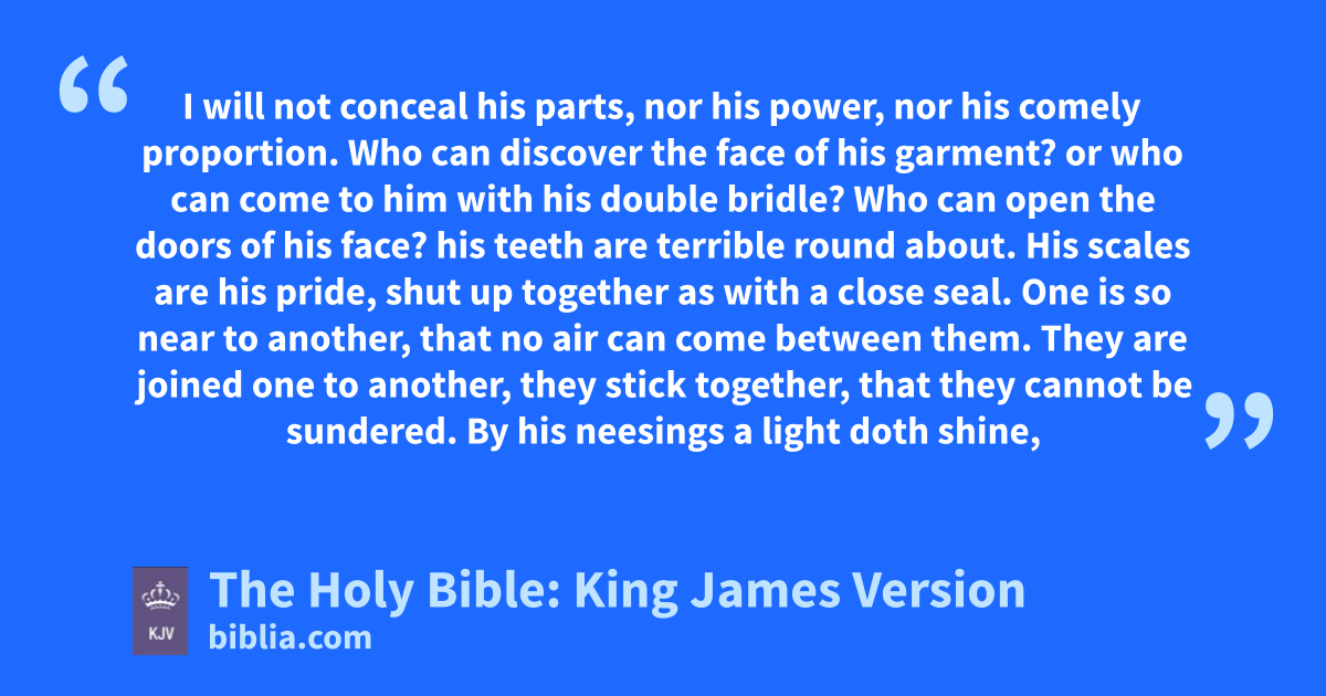 11 Who hath prevented me, that I should repay him? whatsoever is under the whole heaven is mine. 12 I will not conceal his parts, nor his power, nor his comely proportion. 13 Who can discover the face of his garment? or who can come to him with his double bridle? 14 Who can open the doors of his face? his teeth are terrible round about. 15 His scalesb are his pride, shut up together as with a close seal. 16 One is so near to another, that no air can come between them. 17 They are joined one to another, they stick together, that they cannot be sundered. 18 By his neesings a light doth shine, and his eyes are like the eyelids of the morning. 19 Out of his mouth go burning lamps, and sparks of fire leap out. 20 Out of his nostrils goeth smoke, as out of a seething pot or caldron. 21 His breath kindleth coals, and a flame goeth out of his mouth. 22 In his neck remaineth strength, and sorrow is turned into joyc before him. 23 The flakesd of his flesh are joined together: they are firm in themselves; they cannot be moved. 24 His heart is as firm as a stone; yea, as hard as a piece of the nether millstone. 25 When he raiseth up himself, the mighty are afraid: by reason of breakings they purify themselves. 26 The sword of him that layeth at him cannot hold: the spear, the dart, nor the habergeone. 27 He esteemeth iron as straw, and brass as rotten wood. 28 The arrow cannot make him flee: slingstones are turned with him into stubble. 29 Darts are counted as stubble: he laugheth at the shaking of a spear. 30 Sharp stonesf are under him: he spreadeth sharp pointed things upon the mire. 31 He maketh the deep to boil like a pot: he maketh the sea like a pot of ointment. 32 He maketh a path to shine after him; one would think the deep to be hoary. 33 Upon earth there is not his like, who is made without fearg. 34 He beholdeth all high things: he is a king over all the children of pride.