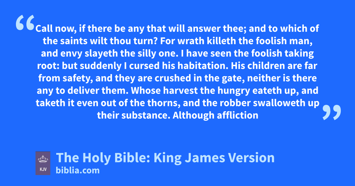 1 Call now, if there be any that will answer thee; and to which of the saints wilt thou turna? 2 For wrath killeth the foolish man, and envyb slayeth the silly one. 3 I have seen the foolish taking root: but suddenly I cursed his habitation. 4 His children are far from safety, and they are crushed in the gate, neither is there any to deliver them. 5 Whose harvest the hungry eateth up, and taketh it even out of the thorns, and the robber swalloweth up their substance.