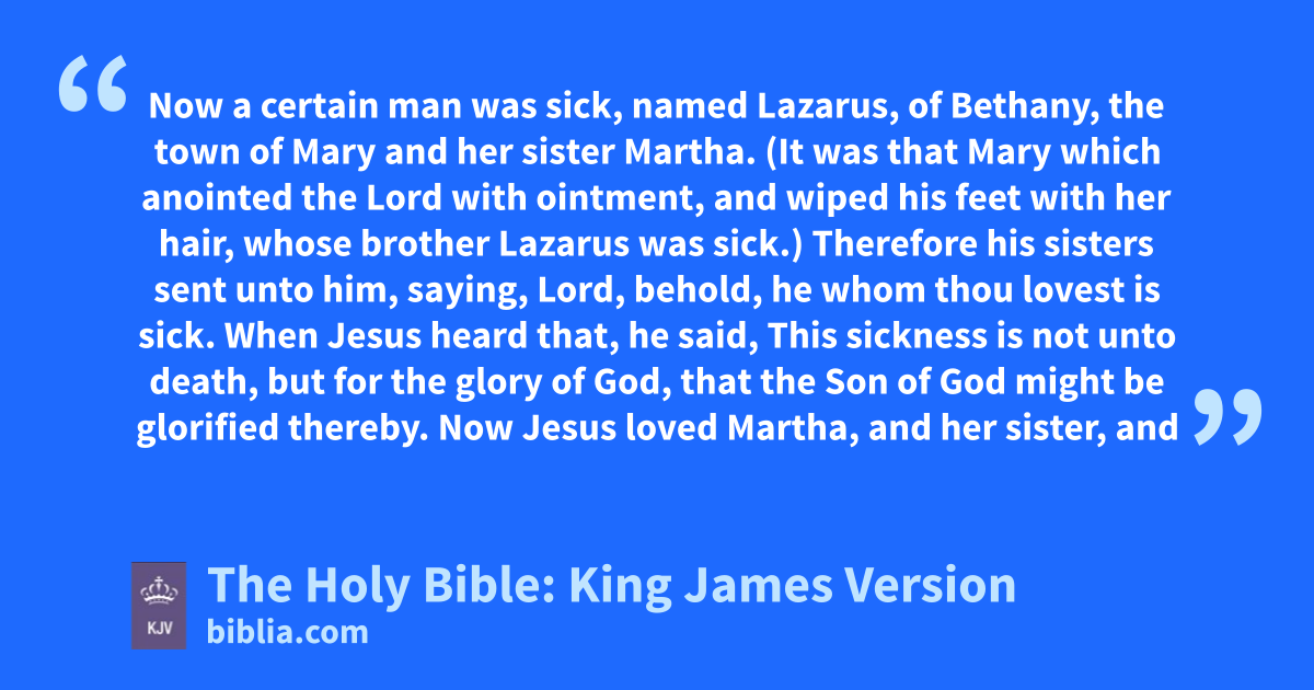 1 Now a certain man was sick, named Lazarus, of Bethany, the town of Mary and her sister Martha. 2 † (It was that Mary which anointed the Lord with ointment, and wiped his feet with her hair, whose brother Lazarus was sick.) 3 Therefore his sisters sent unto him, saying, Lord, behold, he whom thou lovest is sick. 4 When Jesus heard that, he said, This sickness is not unto death, but for the glory of God, that the Son of God might be glorified thereby. 5 Now Jesus loved Martha, and her sister, and Lazarus. 6 When he had heard therefore that he was sick, he abode two days still in the same place where he was. 7 Then after that saith he to his disciples, Let us go into Judaea again. 8 His disciples say unto him, Master, the Jews of late sought to stone thee; and goest thou thither again? 9 Jesus answered, Are there not twelve hours in the day? If any man walk in the day, he stumbleth not, because he seeth the light of this world. 10 But if a man walk in the night, he stumbleth, because there is no light in him. 11 These things said he: and after that he saith unto them, Our friend Lazarus sleepeth; but I go, that I may awake him out of sleep. 12 Then said his disciples, Lord, if he sleep, he shall do well. 13 Howbeit Jesus spake of his death: but they thought that he had spoken of taking of rest in sleep. 14 Then said Jesus unto them plainly, Lazarus is dead. 15 And I am glad for your sakes that I was not there, to the intent ye may believe; nevertheless let us go unto him. 16 Then said Thomas, which is called Didymus, unto his fellowdisciples, Let us also go, that we may die with him.