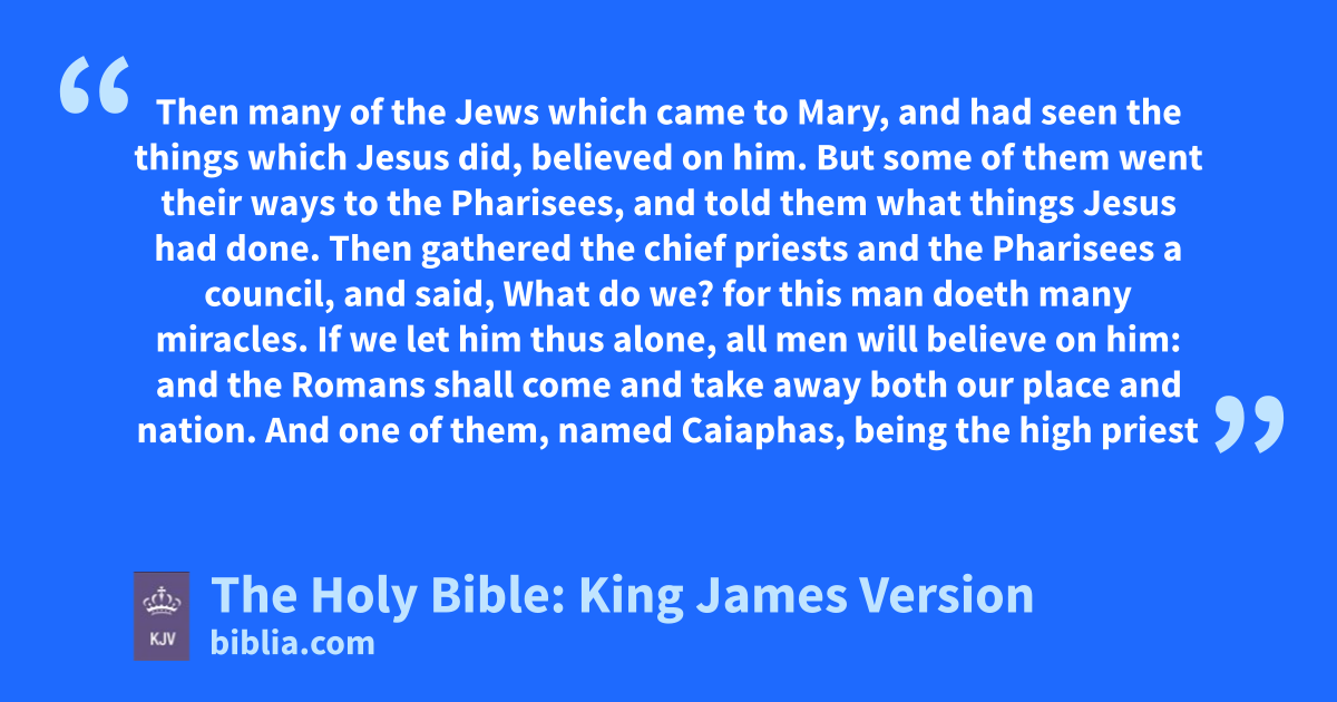 45 Then many of the Jews which came to Mary, and had seen the things which Jesus did, believed on him. 46 But some of them went their ways to the Pharisees, and told them what things Jesus had done. 47 Then gathered the chief priests and the Pharisees a council, and said, What do we? for this man doeth many miracles. 48 If we let him thus alone, all men will believe on him: and the Romans shall come and take away both our place and nation. 49 And one of them, named Caiaphas, being the high priest that same year, said unto them, Ye know nothing at all, 50 Nor consider that it is expedient for us, that one man should die for the people, and that the whole nation perish not. 51 And this spake he not of himself: but being high priest that year, he prophesied that Jesus should die for that nation; 52 And not for that nation only, but that also he should gather together in one the children of God that were scattered abroad. 53 Then from that day forth they took counsel together for to put him to death. 54 Jesus therefore walked no more openly among the Jews; but went thence unto a country near to the wilderness, into a city called Ephraim, and there continued with his disciples. 55 And the Jews’ passover was nigh at hand: and many went out of the country up to Jerusalem before the passover, to purify themselves. 56 Then sought they for Jesus, and spake among themselves, as they stood in the temple, What think ye, that he will not come to the feast? 57 Now both the chief priests and the Pharisees had given a commandment, that, if any man knew where he were, he should shew it, that they might take him.