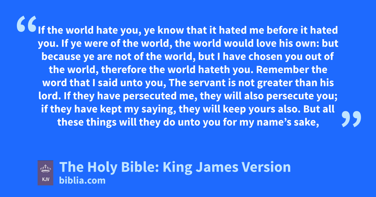 18 If the world hate you, ye know that it hated me before it hated you. 19 If ye were of the world, the world would love his own: but because ye are not of the world, but I have chosen you out of the world, therefore the world hateth you. 20 Remember the word that I said unto you, The servant is not greater than his lord. If they have persecuted me, they will also persecute you; if they have kept my saying, they will keep yours also. 21 But all these things will they do unto you for my name’s sake, because they know not him that sent me. 22 If I had not come and spoken unto them, they had not had sin: but now they have no clokea for their sin. 23 He that hateth me hateth my Father also. 24 If I had not done among them the works which none other man did, they had not had sin: but now have they both seen and hated both me and my Father. 25 But this cometh to pass, that the word might be fulfilled that is written in their law, They hated me without a cause.