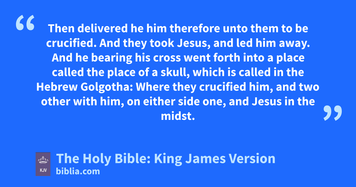 16 Then delivered he him therefore unto them to be crucified. And they took Jesus, and led him away. 17 And he bearing his cross went forth into a place called the place of a skull, which is called in the Hebrew Golgotha: 18 Where they crucified him, and two other with him, on either side one,† and Jesus in the midst.