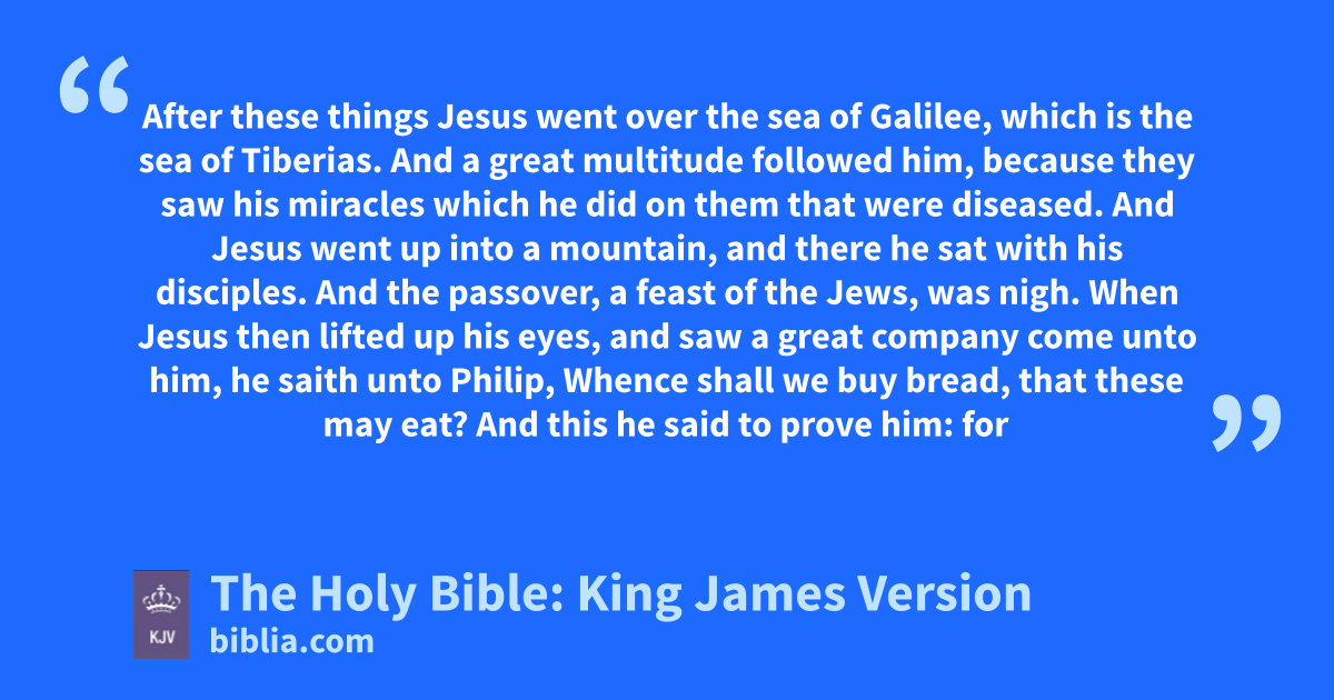1 After these things Jesus went over the sea of Galilee, which is the sea of Tiberias. 2 And a great multitude followed him, because they saw his miracles which he did on them that were diseased. 3 And Jesus went up into a mountain, and there he sat with his disciples. 4 And the passover, a feast of the Jews, was nigh. 5 When Jesus then lifted up his eyes, and saw a great company come unto him, he saith unto Philip, Whence shall we buy bread, that these may eat? 6 And this he said to prove him: for he himself knew what he would do. 7 Philip answered him, Two hundred pennyworth of bread is not sufficient for them, that every one of them may take a little. 8 One of his disciples, Andrew, Simon Peter’s brother, saith unto him, 9 There is a lad here, which hath five barley loaves, and two small fishes: but what are they among so many? 10 And Jesus said, Make the men sit down. Now there was much grass in the place. So the men sat down, in number about five thousand. 11 And Jesus took the loaves; and when he had given thanks, he distributed to the disciples, and the disciples to them that were set down; and likewise of the fishes as much as they would. 12 When they were filled, he said unto his disciples, Gather up the fragments that remain, that nothing be lost. 13 Therefore they gathered them together, and filled twelve baskets with the fragments of the five barley loaves, which remained over and above unto them that had eaten. 14 Then those men, when they had seen the miracle that Jesus did, said, This is of a truth that prophet that should come into the world.