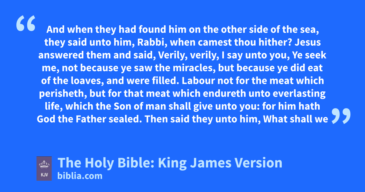 22 The day following, when the people which stood on the other side of the sea saw that there was none other boat there, save that one whereinto his disciples were entered, and that Jesus went not with his disciples into the boat, but that his disciples were gone away alone; 23 (Howbeit there came other boats from Tiberias nigh unto the place where they did eat bread, after that the Lord had given thanks:) 24 When the people therefore saw that Jesus was not there, neither his disciples, they also took shipping, and came to Capernaum, seeking for Jesus. 25 And when they had found him on the other side of the sea, they said unto him, Rabbi, when camest thou hither? 26 Jesus answered them and said, Verily, verily, I say unto you, Ye seek me, not because ye saw the miracles, but because ye did eat of the loaves, and were filled. 27 Labour nota for the meat which perisheth, but for that meat which endureth unto everlasting life, which the Son of man shall give unto you: for him hath God the Father sealed.