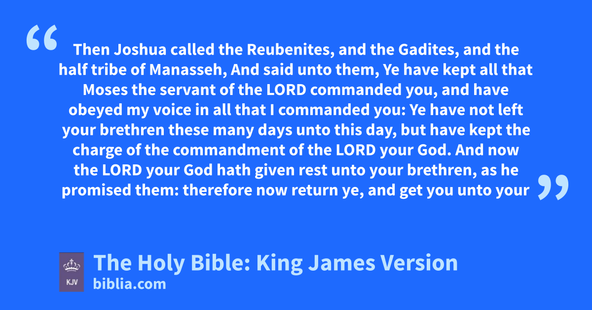 1 Then Joshua called the Reubenites, and the Gadites, and the half tribe of Manasseh, 2 And said unto them, Ye have kept all that Moses the servant of the LORD commanded you, and have obeyed my voice in all that I commanded you: 3 Ye have not left your brethren these many days unto this day, but have kept the charge of the commandment of the LORD your God. 4 And now the LORD your God hath given rest unto your brethren, as he promised them: therefore now return ye, and get you unto your tents, and unto the land of your possession, which Moses the servant of the LORD gave you on the other side Jordan. 5 But take diligent heed to do the commandment and the law, which Moses the servant of the LORD charged you, to love the LORD your God, and to walk in all his ways, and to keep his commandments, and to cleave unto him, and to serve him with all your heart and with all your soul. 6 So Joshua blessed them, and sent them away: and they went unto their tents. 7 Now to the one half of the tribe of Manasseh Moses had given possession in Bashan: but unto the other half thereof gave Joshua among their brethren on this side Jordan westward. And when Joshua sent them away also unto their tents, then he blessed them, 8 And he spake unto them, saying, Return with much riches unto your tents, and with very much cattle, with silver, and with gold, and with brass, and with iron, and with very much raiment: divide the spoil of your enemies with your brethren. 9 And the children of Reuben and the children of Gad and the half tribe of Manasseh returned, and departed from the children of Israel out of Shiloh, which is in the land of Canaan, to go unto the country of Gilead, to the land of their possession, whereof they were possessed, according to the word of the LORD by the hand of Moses.