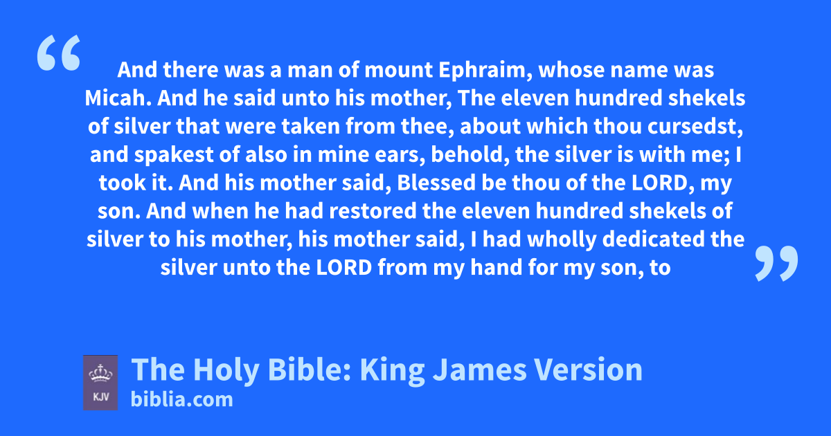1 And there was a man of mount Ephraim, whose name was Micah. 2 And he said unto his mother, The eleven hundred shekels of silver that were taken from thee, about which thou cursedst, and spakest of also in mine ears, behold, the silver is with me; I took it. And his mother said, Blessed be thou of the LORD, my son. 3 And when he had restored the eleven hundred shekels of silver to his mother, his mother said, I had wholly dedicated the silver unto the LORD from my hand for my son, to make a graven image and a molten image: now therefore I will restore it unto thee. 4 Yet he restored the money unto his mother; and his mother took two hundred shekels of silver, and gave them to the founder, who made thereof a graven image and a molten image: and they were in the house of Micah. 5 And the man Micah had an house of gods, and made an ephod, and teraphim, and consecrateda one of his sons, who became his priest. 6 In those days there was no king in Israel, but every man did that which was right in his own eyes.