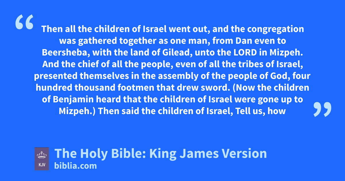 1 Then all the children of Israel went out, and the congregation was gathered together as one man, from Dan even to Beersheba, with the land of Gilead, unto the LORD in Mizpeh. 2 And the chief of all the people, even of all the tribes of Israel, presented themselves in the assembly of the people of God, four hundred thousand footmen that drew sword. 3 (Now the children of Benjamin heard that the children of Israel were gone up to Mizpeh.) Then said the children of Israel, Tell us, how was this wickedness? 4 And the Levitea, the husband of the woman that was slain, answered and said, I came into Gibeah that belongeth to Benjamin, I and my concubine, to lodge. 5 And the men of Gibeah rose against me, and beset the house round about upon me by night, and thought to have slain me: and my concubine have they forcedb, that she is dead. 6 And I took my concubine, and cut her in pieces, and sent her throughout all the country of the inheritance of Israel: for they have committed lewdness and folly in Israel. 7 Behold, ye are all children of Israel; give here your advice and counsel. 8 And all the people arose as one man, saying, We will not any of us go to his tent, neither will we any of us turn into his house. 9 But now this shall be the thing which we will do to Gibeah; we will go up by lot against it; 10 And we will take ten men of an hundred throughout all the tribes of Israel, and an hundred of a thousand, and a thousand out of ten thousand, to fetch victual for the people, that they may do, when they come to Gibeah of Benjamin, according to all the folly that they have wrought in Israel. 11 So all the men of Israel were gathered against the city, knit together as one man.