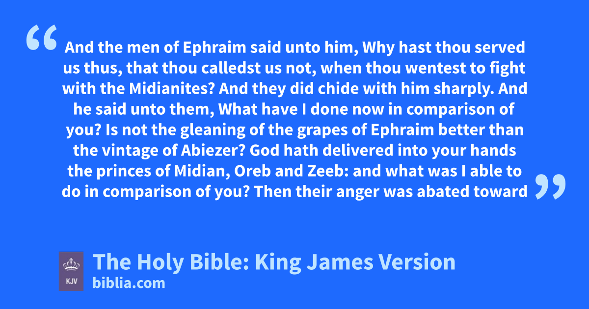 1 And the men of Ephraim said unto him, Why hast thou served us thus, that thou calledst us not, when thou wentest to fight with the Midianites? And they did chide with him sharply. 2 And he said unto them, What have I done now in comparison of you? Is not the gleaning of the grapes of Ephraim better than the vintage of Abiezer? 3 God hath delivered into your hands the princes of Midian, Oreb and Zeeb: and what was I able to do in comparison of you? Then their angera was abated toward him, when he had said that.