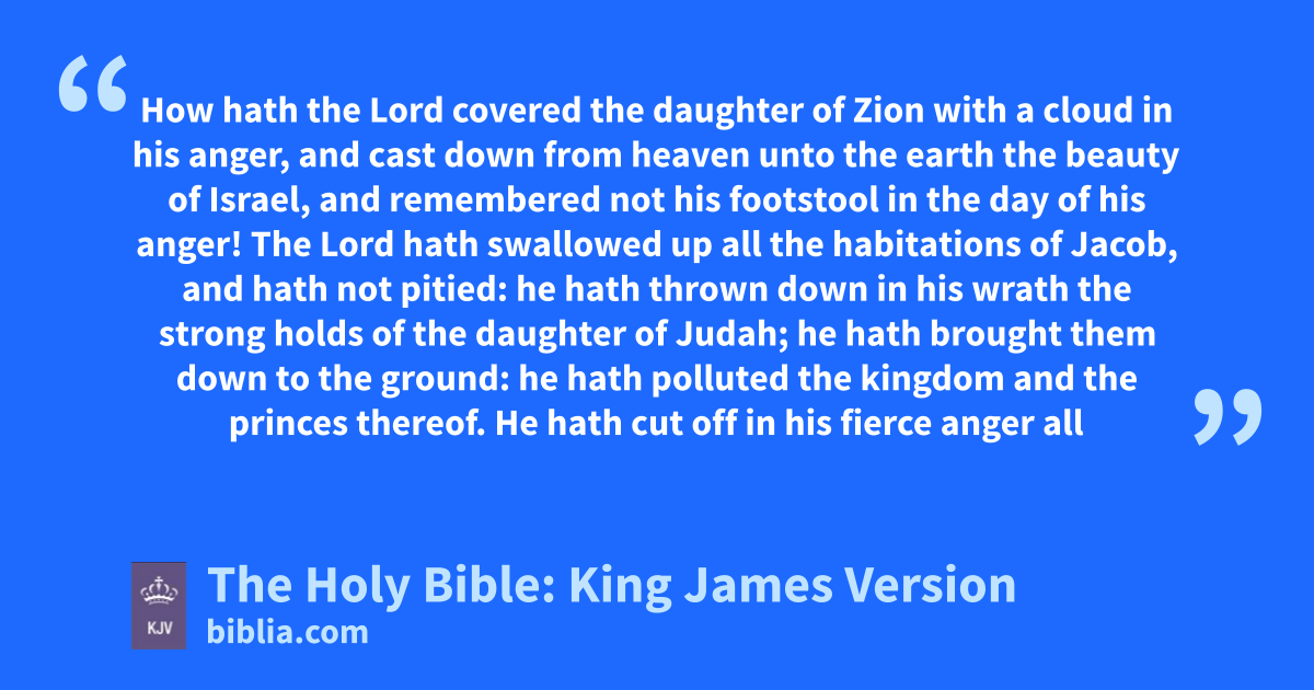 1 How hath the Lord covered the daughter of Zion with a cloud in his anger, and cast down from heaven unto the earth the beauty of Israel, and remembered not his footstool in the day of his anger! 2 The Lord hath swallowed up all the habitations of Jacob, and hath not pitied: he hath thrown down in his wrath the strong holds of the daughter of Judah; he hath brought them downa to the ground: he hath polluted the kingdom and the princes thereof. 3 He hath cut off in his fierce anger all the horn of Israel: he hath drawn back his right hand from before the enemy, and he burned against Jacob like a flaming fire, which devoureth round about. 4 He hath bent his bow like an enemy: he stood with his right hand as an adversary, and slew all that were pleasantb to the eye in the tabernacle of the daughter of Zion: he poured out his fury like fire. 5 The Lord was as an enemy: he hath swallowed up Israel, he hath swallowed up all her palaces: he hath destroyed his strong holds, and hath increased in the daughter of Judah mourning and lamentation. 6 And he hath violently taken away his tabernaclec, as if it were of a garden: he hath destroyed his places of the assembly: the LORD hath caused the solemn feasts and sabbaths to be forgotten in Zion, and hath despised in the indignation of his anger the king and the priest. 7 The Lord hath cast off his altar, he hath abhorred his sanctuary, he hath given upd into the hand of the enemy the walls of her palaces; they have made a noise in the house of the LORD, as in the day of a solemn feast. 8 The LORD hath purposed to destroy the wall of the daughter of Zion: he hath stretched out a line, he hath not withdrawn his hand from destroyinge: therefore he made the rampart and the wall to lament; they languished together. 9 Her gates are sunk into the ground; he hath destroyed and broken her bars: her king and her princes are among the Gentiles: the law is no more; her prophets also find no vision from the LORD.