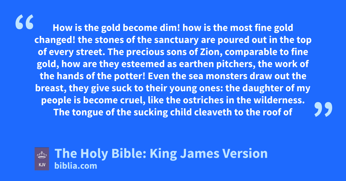 1 How is the gold become dim! how is the most fine gold changed! the stones of the sanctuary are poured out in the top of every street. 2 The precious sons of Zion, comparable to fine gold, how are they esteemed as earthen pitchers, the work of the hands of the potter! 3 Even the sea monsters draw out the breast, they give suck to their young ones: the daughter of my people is become cruel, like the ostriches in the wilderness. 4 The tongue of the sucking child cleaveth to the roof of his mouth for thirst: the young children ask bread, and no man breaketh it unto them. 5 They that did feed delicately are desolate in the streets: they that were brought up in scarlet embrace dunghills. 6 For the punishment of the iniquitya of the daughter of my people is greater than the punishment of the sin of Sodom, that was overthrown as in a moment, and no hands stayed on her. 7 Her Nazarites were purer than snow, they were whiter than milk, they were more ruddy in body than rubies, their polishing was of sapphire: 8 Their visage is blackerb than a coal; they are not known in the streets: their skin cleaveth to their bones; it is withered, it is become like a stick. 9 They that be slain with the sword are better than they that be slain with hunger: for these pine away, stricken through for want of the fruits of the field. 10 The hands of the pitiful women have sodden their own children: they were their meat in the destruction of the daughter of my people. 11 The LORD hath accomplished his fury; he hath poured out his fierce anger, and hath kindled a fire in Zion, and it hath devoured the foundations thereof. 12 The kings of the earth, and all the inhabitants of the world, would not have believed that the adversary and the enemy should have entered into the gates of Jerusalem.