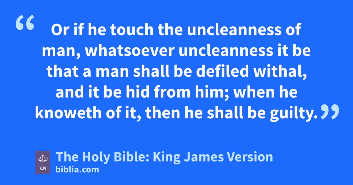 1 And if a soul sin, and hear the voice of swearing, and is a witness, whether he hath seen or known of it; if he do not utter it, then he shall bear his iniquity. 2 Or if a soul touch any unclean thing, whether it be a carcase of an unclean beast, or a carcase of unclean cattle, or the carcase of unclean creeping things, and if it be hidden from him; he also shall be unclean, and guilty. 3 Or if he touch the uncleanness of man, whatsoever uncleanness it be that a man shall be defiled withal, and it be hid from him; when he knoweth of it, then he shall be guilty. 4 Or if a soul swear, pronouncing with his lips to do evil, or to do good, whatsoever it be that a man shall pronounce with an oath, and it be hid from him; when he knoweth of it, then he shall be guilty in one of these. 5 And it shall be, when he shall be guilty in one of these things, that he shall confess that he hath sinned in that thing: 6 And he shall bring his trespass offering unto the LORD for his sin which he hath sinned, a female from the flock, a lamb or a kid of the goats, for a sin offering; and the priest shall make an atonement for him concerning his sin.