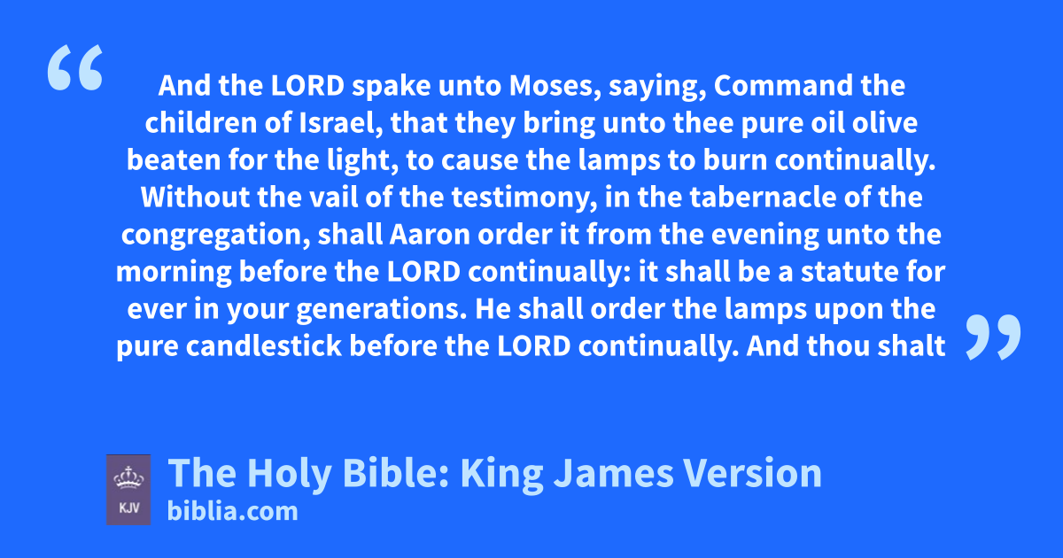 1 And the LORD spake unto Moses, saying, 2 Command the children of Israel, that they bring unto thee pure oil olive beaten for the light, to cause the lamps to burn continually. 3 Without the vail of the testimony, in the tabernacle of the congregation, shall Aaron order it from the evening unto the morning before the LORD continually: it shall be a statute for ever in your generations. 4 He shall order the lamps upon the pure candlestick before the LORD continually. 5 And thou shalt take fine flour, and bake twelve cakes thereof: two tenth deals shall be in one cake. 6 And thou shalt set them in two rows, six on a row, upon the pure table before the LORD. 7 And thou shalt put pure frankincense upon each row, that it may be on the bread for a memorial, even an offering made by fire unto the LORD. 8 Every sabbath he shall set it in order before the LORD continually, being taken from the children of Israel by an everlasting covenant. 9 And it shall be Aaron’s and his sons’; and they shall eat it in the holy place: for it is most holy unto him of the offerings of the LORD made by fire by a perpetual statute.