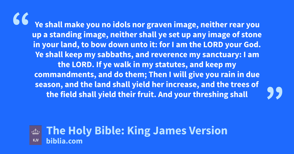 1 Ye shall make you no idols nor graven image, neither rear you up a standing image, neither shall ye set up any image of stone in your land, to bow down unto it: for I am the LORD your God. 2 Ye shall keep my sabbaths, and reverence my sanctuary: I am the LORD. 3 If ye walk in my statutes, and keep my commandments, and do them; 4 Then I will give you rain in due season, and the land shall yield her increase, and the trees of the field shall yield their fruit. 5 And your threshing shall reach unto the vintage, and the vintage shall reach unto the sowing time: and ye shall eat your bread to the full, and dwell in your land safely. 6 And I will give peace in the land, and ye shall lie down, and none shall make you afraid: and I will rida evil beasts out of the land, neither shall the sword go through your land. 7 And ye shall chase your enemies, and they shall fall before you by the sword. 8 And five of you shall chase an hundred, and an hundred of you shall put ten thousand to flight: and your enemies shall fall before you by the sword. 9 For I will have respect unto you, and make you fruitful, and multiply you, and establish my covenant with you. 10 And ye shall eat old store, and bring forth the old because of the new. 11 And I will set my tabernacle among you: and my soul shall not abhor you. 12 And I will walk among you, and will be your God, and ye shall be my people. 13 I am the LORD your God, which brought you forth out of the land of Egypt, that ye should not be their bondmen; and I have broken the bands of your yoke, and made you go upright.