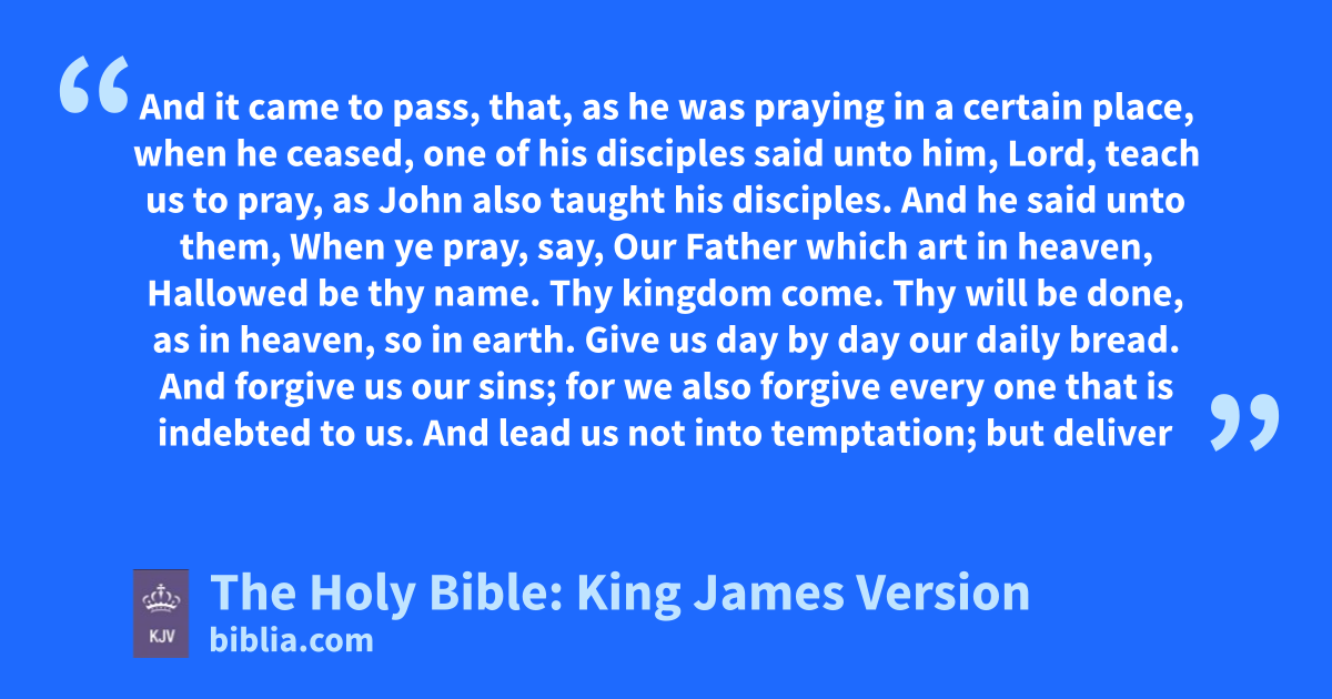 1 And it came to pass, that, as he was praying in a certain place, when he ceased, one of his disciples said unto him, Lord, teach us to pray, as John also taught his disciples. 2 And he said unto them, When ye pray, say, Our Father which art in heaven, Hallowed be thy name. Thy kingdom come. Thy will be done, as in heaven, so in earth. 3 Give us day by daya our daily bread. 4 And forgive us our sins; for we also forgive every one that is indebted to us. And lead us not into temptation; but deliver us from evil. 5 And he said unto them, Which of you shall have a friend, and shall go unto him at midnight, and say unto him, Friend, lend me three loaves; 6 For a friend of mine inb his journey is come to me, and I have nothing to set before him? 7 And he from within shall answer and say, Trouble me not: the door is now shut, and my children are with me in bed; I cannot rise and give thee. 8 I say unto you, Though he will not rise and give him, because he is his friend, yet because of his importunity he will rise and give him as many as he needeth. 9 And I say unto you, Ask, and it shall be given you; seek, and ye shall find; knock, and it shall be opened unto you. 10 For every one that asketh receiveth; and he that seeketh findeth; and to him that knocketh it shall be opened. 11 If a son shall ask bread of any of you that is a father, will he give him a stone? or if he ask a fish, will he for a fish give him a serpent? 12 Or if he shall ask an egg, will he offerc him a scorpion? 13 If ye then, being evil, know how to give good gifts unto your children: how much more shall your heavenly Father give the Holy Spirit to them that ask him?