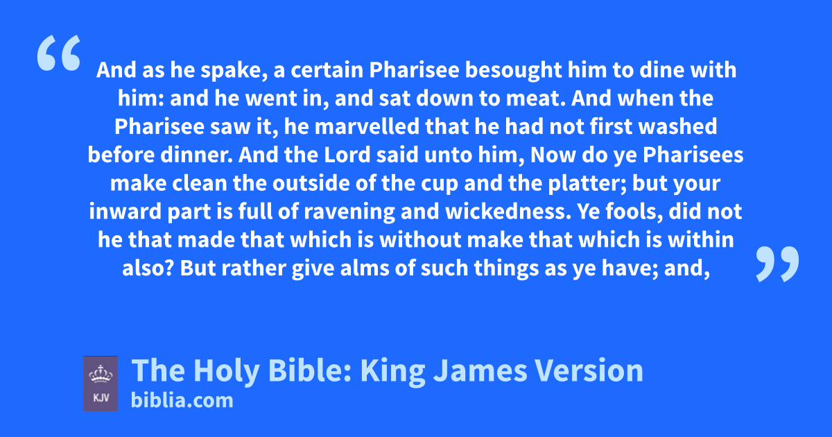 37 And as he spake, a certain Pharisee besought him to dine with him: and he went in, and sat down to meat. 38 And when the Pharisee saw it, he marvelled that he had not first washed before dinner. 39 And the Lord said unto him, Now do ye Pharisees make clean the outside of the cup and the platter; but your inward part is full of ravening and wickedness. 40 Ye fools, did not he that made that which is without make that which is within also? 41 But rather give alms of such things as ye have; and, behold, all things are clean unto you. 42 But woe unto you, Pharisees! for ye tithe mint and rue and all manner of herbs, and pass over judgment and the love of God: these ought ye to have done, and not to leave the other undone. 43 Woe unto you, Pharisees! for ye love the uppermost seats in the synagogues, and greetings in the markets. 44 Woe unto you, scribes and Pharisees, hypocrites! for ye are as graves which appear not, and the men that walk over them are not aware of them. 45 Then answered one of the lawyers, and said unto him, Master, thus saying thou reproachest us also. 46 And he said, Woe unto you also, ye lawyers! for ye lade men with burdens grievous to be borne, and ye yourselves touch not the burdens with one of your fingers. 47 Woe unto you! for ye build the sepulchres of the prophets, and your fathers killed them. 48 Truly ye bear witness that ye allow the deeds of your fathers: for they indeed killed them, and ye build their sepulchres. 49 Therefore also said the wisdom of God, I will send them prophets and apostles, and some of them they shall slay and persecute: 50 That the blood of all the prophets, which was shed from the foundation of the world, may be required of this generation; 51 From the blood of Abel unto the blood of Zacharias, which perished between the altar and the temple: verily I say unto you, It shall be required of this generation. 52 Woe unto you, lawyers! for ye have taken away the key of knowledge: ye entered not in yourselves, and them that were entering in ye hinderede. 53 And as he said these things unto them, the scribes and the Pharisees began to urge him vehemently, and to provoke him to speak of many things: 54 Laying wait for him, and seeking to catch something out of his mouth, that they might accuse him.