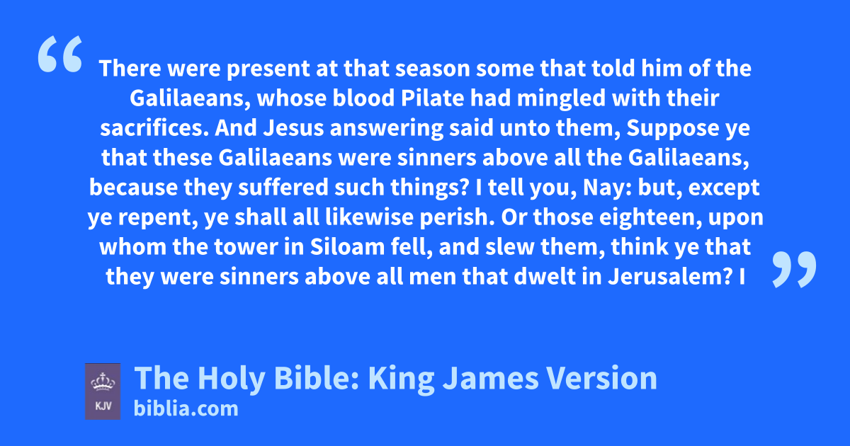 1 † There were present at that season some that told him of the Galilaeans, whose blood Pilate had mingled with their sacrifices. 2 And Jesus answering said unto them, Suppose ye that these Galilaeans were sinners above all the Galilaeans, because they suffered such things? 3 I tell you, Nay: but, except ye repent, ye shall all likewise perish. 4 Or those eighteen,† upon whom the tower in Siloam fell, and slew them, think ye that they were sinnersa above all men that dwelt in Jerusalem? 5 I tell you, Nay: but, except ye repent, ye shall all likewise perish.
