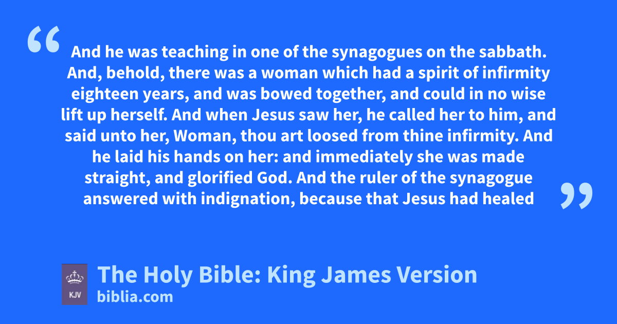 10 And he was teaching in one of the synagogues on the sabbath. 11 And, behold, there was a woman which had a spirit of infirmity eighteen years, and was bowed together, and could in no wise lift up herself. 12 And when Jesus saw her, he called her to him, and said unto her, Woman, thou art loosed from thine infirmity. 13 And he laid his hands on her: and immediately she was made straight, and glorified God. 14 And the ruler of the synagogue answered with indignation, because that Jesus had healed on the sabbath day, and said unto the people, There are six days in which men ought to work: in them therefore come and be healed, and not on the sabbath day. 15 The Lord then answered him, and said, Thou hypocrite, doth not each one of you on the sabbath loose his ox or his ass from the stall, and lead him away to watering? 16 And ought not this woman, being a daughter of Abraham, whom Satan hath bound, lo, these eighteen years, be loosed from this bond on the sabbath day? 17 And when he had said these things, all his adversaries were ashamed: and all the people rejoiced for all the glorious things that were done by him.