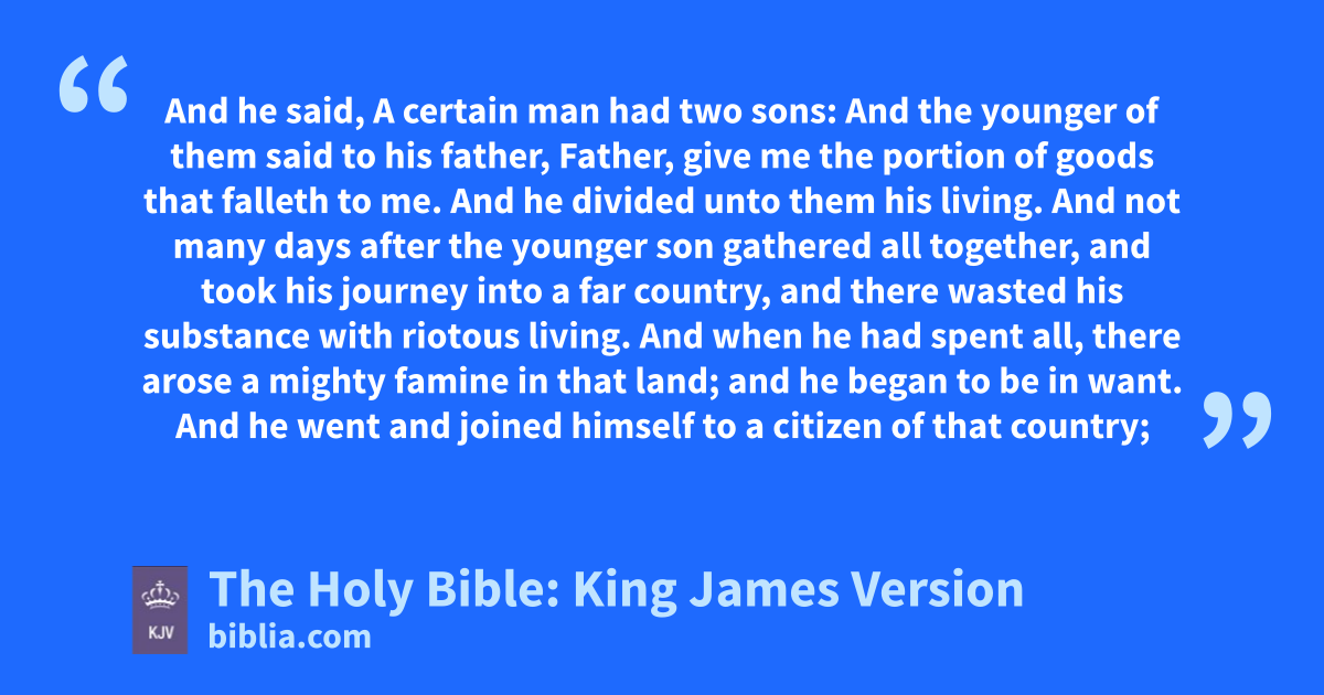 11 And he said, A certain man had two sons: 12 And the younger of them said to his father, Father, give me the portion of goods that falleth to me. And he divided unto them his living. 13 And not many days after the younger son gathered all together, and took his journey into a far country, and there wasted his substance with riotous living. 14 And when he had spent all, there arose a mighty famine in that land; and he began to be in want. 15 And he went and joined himself to a citizen of that country; and he sent him into his fields to feed swine. 16 And he would fain have filled his belly with the husks that the swine did eat: and no man gave unto him. 17 And when he came to himself, he said, How many hired servants of my father’s have bread enough and to spare, and I perish with hunger! 18 I will arise and go to my father, and will say unto him, Father, I have sinned against heaven, and before thee, 19 And am no more worthy to be called thy son: make me as one of thy hired servants. 20 And he arose, and came to his father. But when he was yet a great way off, his father saw him, and had compassion, and ran, and fell on his neck, and kissed him. 21 And the son said unto him, Father, I have sinned against heaven, and in thy sight, and am no more worthy to be called thy son. 22 But the father said to his servants, Bring forth the best robe, and put it on him; and put a ring on his hand, and shoes on his feet: 23 And bring hither the fatted calf, and kill it; and let us eat, and be merry: 24 For this my son was dead, and is alive again; he was lost, and is found. And they began to be merry. 25 Now his elder son was in the field: and as he came and drew nigh to the house, he heard musick and dancing. 26 And he called one of the servants, and asked what these things meant. 27 And he said unto him, Thy brother is come; and thy father hath killed the fatted calf, because he hath received him safe and sound. 28 And he was angry, and would not go in: therefore came his father out, and intreated him. 29 And he answering said to his father, Lo, these many years do I serve thee, neither transgressed I at any time thy commandment: and yet thou never gavest me a kid, that I might make merry with my friends: 30 But as soon as this thy son was come, which hath devoured thy living with harlots, thou hast killed for him the fatted calf. 31 And he said unto him, Son, thou art ever with me, and all that I have is thine. 32 It was meet that we should make merry, and be glad: for this thy brother was dead, and is alive again; and was lost, and is found.