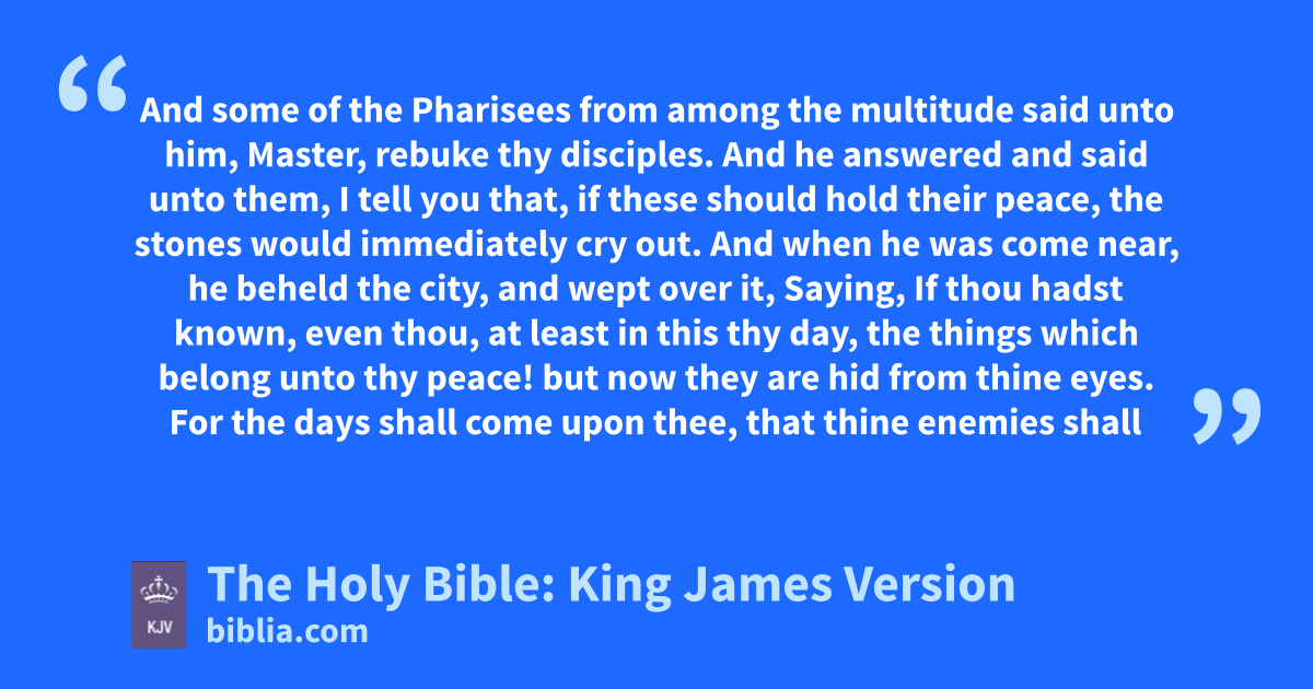 41 And when he was come near, he beheld the city, and wept over it, 42 Saying, If thou hadst known, even thou, at least in this thy day, the things which belong unto thy peace! but now they are hid from thine eyes. 43 For the days shall come upon thee, that thine enemies shall cast a trench about thee, and compass thee round, and keep thee in on every side, 44 And shall lay thee even with the ground, and thy children within thee; and they shall not leave in thee one stone upon another; because thou knewest not the time of thy visitation. 45 And he went into the temple, and began to cast out them that sold therein, and them that bought; 46 Saying unto them, It is written, My house is the house of prayer: but ye have made it a den of thieves. 47 And he taught daily in the temple. But the chief priests and the scribes and the chief of the people sought to destroy him, 48 And could not find what they might do: for all the people were very attentive to hear him.