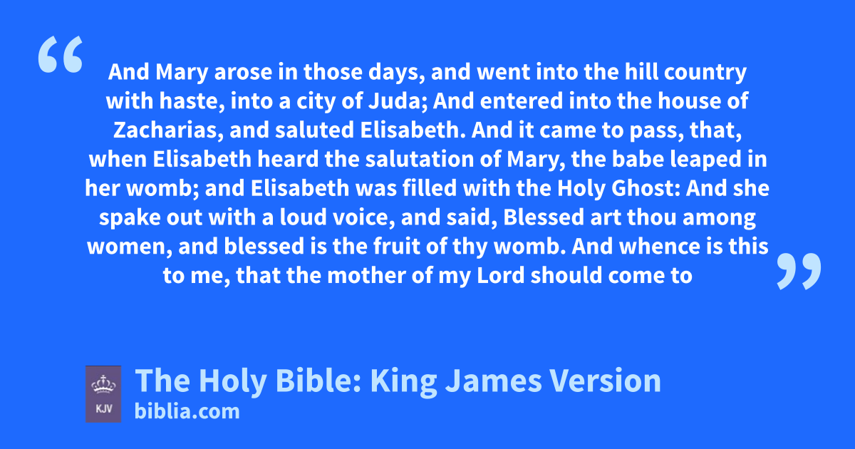 39 And Mary arose in those days, and went into the hill country with haste, into a city of Juda; 40 And entered into the house of Zacharias, and saluted Elisabeth. 41 And it came to pass, that, when Elisabeth heard the salutation of Mary, the babe leaped in her womb; and Elisabeth was filled with the Holy Ghost: 42 And she spake out with a loud voice, and said, Blessed art thou among women, and blessed is the fruit of thy womb. 43 And whence is this to me, that the mother of my Lord should come to me? 44 For, lo, as soon as the voice of thy salutation sounded in mine ears, the babe leaped in my womb for joy. 45 And blessed is she that believed: for there shall be a performance of those things which were told her from the Lord. 46 And Mary said, My soul doth magnify the Lord, 47 And my spirit hath rejoiced in God my Saviour. 48 For he hath regarded the low estate of his handmaiden: for, behold, from henceforth all generations shall call me blessed. 49 For he that is mighty hath done to me great things; and holy is his name. 50 And his mercy is on them that fear him from generation to generation. 51 He hath shewed strength with his arm; he hath scattered the proud in the imagination of their hearts. 52 He hath put down the mighty from their seats, and exalted them of low degree. 53 He hath filled the hungry with good things; and the rich he hath sent empty away. 54 He hath holpen his servant Israel, in remembrance of his mercy; 55 As he spake to our fathers, to Abraham, and to his seed for ever. 56 And Mary abode with her about three months, and returned to her own house.