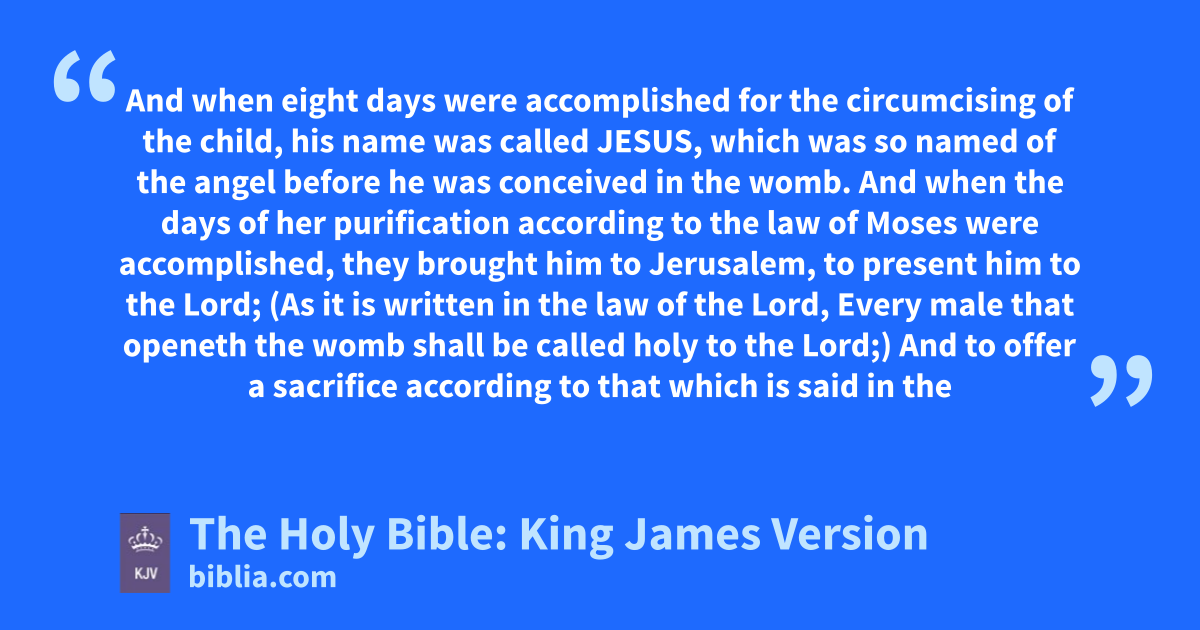 21 And when eight days were accomplished for the circumcising of the child, his name was called JESUS, which was so named of the angel before he was conceived in the womb. 22 And when the days of her purification according to the law of Moses were accomplished, they brought him to Jerusalem, to present him to the Lord; 23 (As it is written in the law of the Lord, Every male that openeth the womb shall be called holy to the Lord;) 24 And to offer a sacrifice according to that which is said in the law of the Lord, A pair of turtledoves, or two young pigeons.