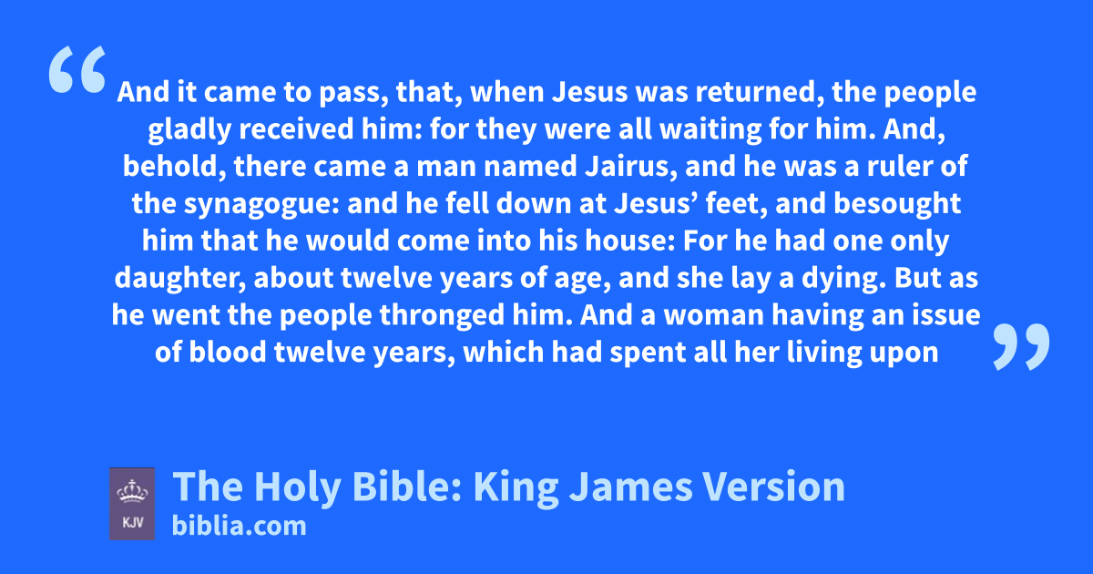 40 And it came to pass, that, when Jesus was returned, the people gladly received him: for they were all waiting for him. 41 And, behold, there came a man named Jairus, and he was a ruler of the synagogue: and he fell down at Jesus’ feet, and besought him that he would come into his house: 42 For he had one only daughter, about twelve years of age, and she lay a dying. But as he went the people thronged him. 43 And a woman having an issue of blood twelve years, which had spent all her living upon physicians, neither could be healed of any, 44 Came behind him, and touched the border of his garment: and immediately her issue of blood stanched. 45 And Jesus said, Who touched me? When all denied, Peter and they that were with him said, Master, the multitude throng thee and press thee, and sayest thou, Who touched me? 46 And Jesus said, Somebody hath touched me: for I perceive that virtue is gone out of me. 47 And when the woman saw that she was not hid, she came trembling, and falling down before him, she declared unto him before all the people for what cause she had touched him, and how she was healed immediately. 48 And he said unto her, Daughter, be of good comfort: thy faith hath made thee whole; go in peace. 49 While he yet spake, there cometh one from the ruler of the synagogue’s house, saying to him, Thy daughter is dead; trouble not the Master. 50 But when Jesus heard it, he answered him, saying, Fear not: believe only, and she shall be made whole. 51 And when he came into the house, he suffered no man to go in, save Peter, and James, and John, and the father and the mother of the maiden. 52 And all wept, and bewailed her: but he said, Weep not; she is not dead, but sleepeth. 53 And they laughed him to scorn, knowing that she was dead. 54 And he put them all out, and took her by the hand, and called, saying, Maid, arise. 55 And her spirit came again, and she arose straightway: and he commanded to give her meat. 56 And her parents were astonished: but he charged them that they should tell no man what was done.