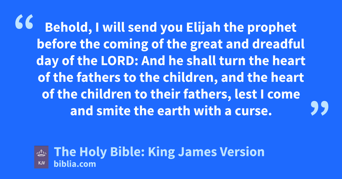 4 Remember ye the law of Moses my servant, which I commanded unto him in Horeb for all Israel, with the statutes and judgments. 5 Behold, I will send you Elijah the prophet before the coming of the great and dreadful day of the LORD: 6 And he shall turn the heart of the fathers to the children, and the heart of the children to their fathers, lest I come and smite the earth with a curse.