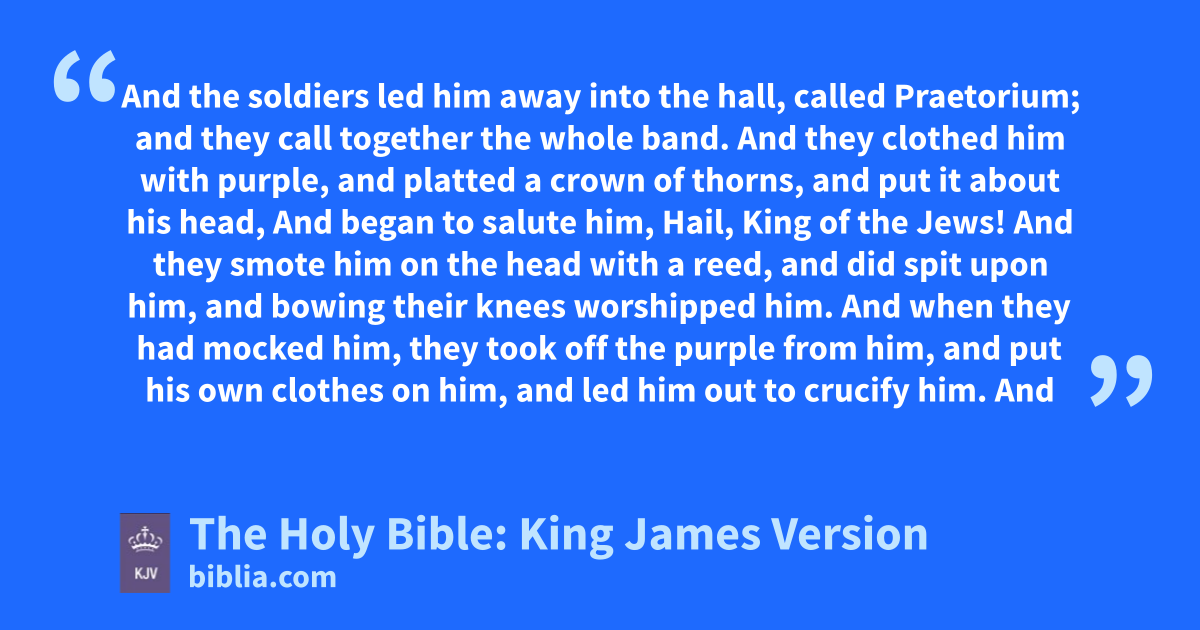 15 And so Pilate, willing to content the people, released Barabbas unto them, and delivered Jesus, when he had scourged him, to be crucified. 16 And the soldiers led him away into the hall, called Praetoriuma; and they call together the whole band. 17 And they clothed him with purple, and platted a crown of thorns, and put it about his head, 18 And began to salute him, Hail, King of the Jews! 19 And they smote him on the head with a reed, and did spit upon him, and bowing their knees worshipped him. 20 And when they had mocked him, they took off the purple from him, and put his own clothes on him, and led him out to crucify him. 21 And they compel one Simon a Cyrenian, who passed by, coming out of the country, the father of Alexander and Rufus, to bear his cross.