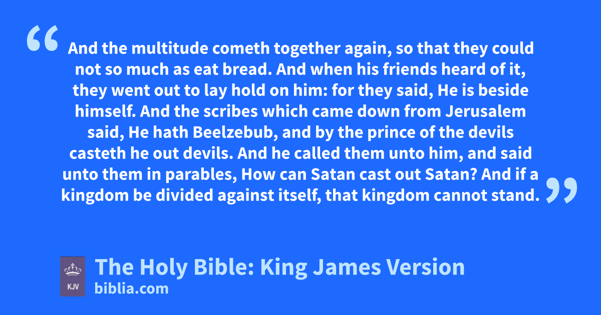 22 And the scribes which came down from Jerusalem said, He hath Beelzebub, and by the prince of the devils casteth he out devils. 23 And he called them unto him, and said unto them in parables, How can Satan cast out Satan? 24 And if a kingdom be divided against itself, that kingdom cannot stand. 25 And if a house be divided against itself, that house cannot stand. 26 And if Satan rise up against himself, and be divided, he cannot stand, but hath an end. 27 No man can enter into a strong man’s house, and spoil his goods, except he will first bind the strong man; and then he will spoil his house. 28 Verily I say unto you, All sins shall be forgiven unto the sons of men, and blasphemies wherewith soever they shall blaspheme: 29 But he that shall blaspheme against the Holy Ghost hath never forgiveness, but is in danger of eternal damnation: 30 Because they said, He hath an unclean spirit.