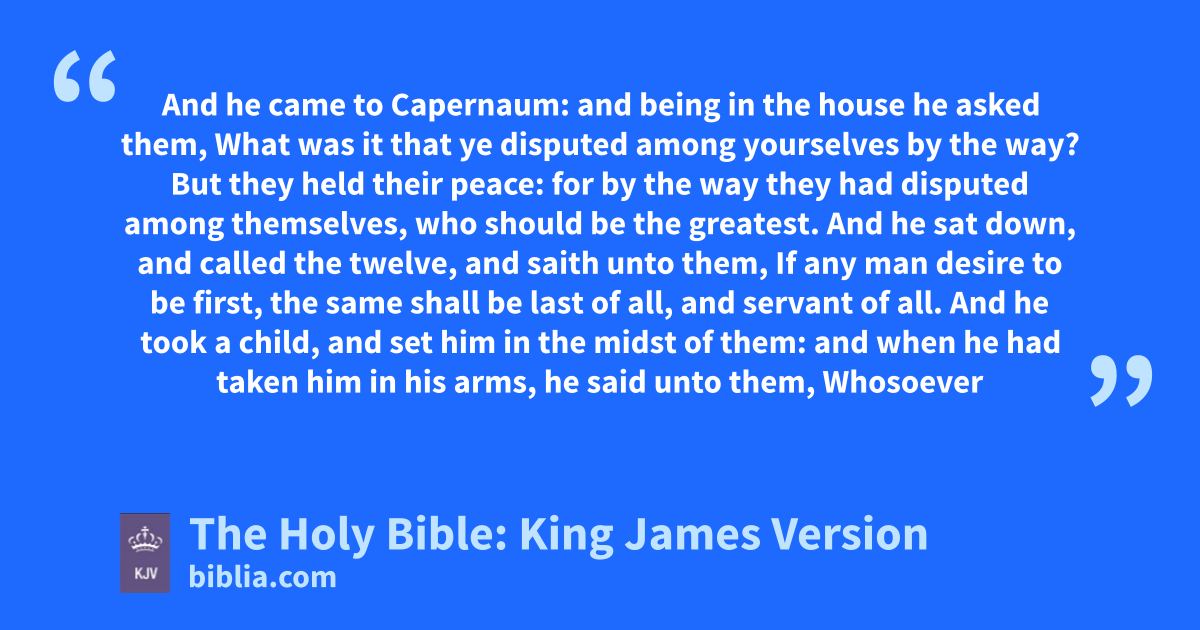 30 And they departed thence, and passed through Galilee; and he would not that any man should know it. 31 For he taught his disciples, and said unto them, The Son of man is delivered into the hands of men, and they shall kill him; and after that he is killed, he shall rise the third day. 32 But they understood not that saying, and were afraid to ask him. 33 And he came to Capernaum: and being in the house he asked them, What was it that ye disputed among yourselves by the way? 34 But they held their peace: for by the way they had disputed among themselves, who should be the greatest. 35 And he sat down, and called the twelve, and saith unto them, If any man desire to be first, the same shall be last of all, and servant of all. 36 And he took a child, and set him in the midst of them: and when he had taken him in his arms, he said unto them, 37 Whosoever shall receive one of such children in my name, receiveth me: and whosoever shall receive me, receiveth not me, but him that sent me. 38 And John answered him, saying, Master, we saw one casting out devils in thy name, and he followeth not us: and we forbad him, because he followeth not us. 39 But Jesus said, Forbid him not: for there is no man which shall do a miracle in my name, that can lightly speak evil of me. 40 For he that is not against us is on our part.