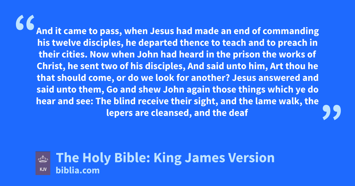 1 And it came to pass, when Jesus had made an end of commanding his twelve disciples, he departed thence to teach and to preach in their cities. 2 Now when John had heard in the prison the works of Christ, he sent two of his disciples, 3 And said unto him, Art thou he that should come, or do we look for another? 4 Jesus answered and said unto them, Go and shew John again those things which ye do hear and see: 5 The blind receive their sight, and the lame walk, the lepers are cleansed, and the deaf hear, the dead are raised up, and the poor have the gospel preached to them. 6 And blessed is he, whosoever shall not be offended in me.