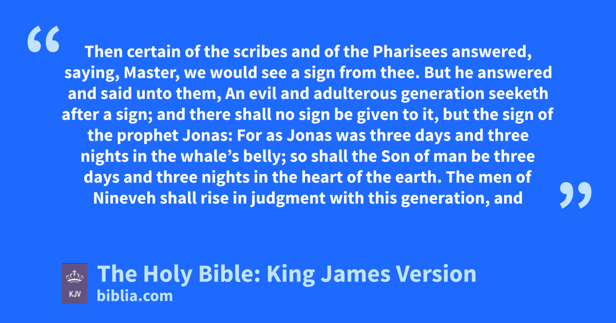 38 Then certain of the scribes and of the Pharisees answered, saying, Master, we would see a sign from thee. 39 But he answered and said unto them, An evil and adulterous generation seeketh after a sign; and there shall no sign be given to it, but the sign of the prophet Jonas: 40 For as Jonas was three days and three nights in the whale’s belly; so shall the Son of man be three days and three nights in the heart of the earth. 41 The men of Nineveh shall rise in judgment with this generation, and shall condemn it: because they repented at the preaching of Jonas; and, behold, a greater than Jonas is here. 42 The queen of the south shall rise up in the judgment with this generation, and shall condemn it: for she came from the uttermost parts of the earth to hear the wisdom of Solomon; and, behold, a greater than Solomon is here. 43 † When the unclean spirit is gone out of a man, he walketh through dry places, seeking rest, and findeth none. 44 Then he saith, I will return into my house from whence I came out; and when he is come, he findeth it empty, swept, and garnished. 45 Then goeth he, and taketh with himself seven other spirits more wicked than himself, and they enter in and dwell there: and the last state of that man is worse than the first. Even so shall it be also unto this wicked generation.