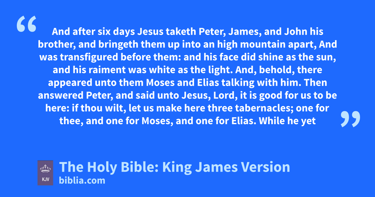 1 And after six days Jesus taketh Peter, James, and John his brother, and bringeth them up into an high mountain apart, 2 And was transfigured before them: and his face did shine as the sun, and his raiment was white as the light. 3 And, behold, there appeared unto them Moses and Elias talking with him. 4 Then answered Peter, and said unto Jesus, Lord, it is good for us to be here: if thou wilt, let us make here three tabernacles; one for thee, and one for Moses, and one for Elias. 5 While he yet spake, behold, a bright cloud overshadowed them: and behold a voice out of the cloud, which said, This is my beloved Son, in whom I am well pleased; hear ye him. 6 And when the disciples heard it, they fell on their face, and were sore afraid. 7 And Jesus came and touched them, and said, Arise, and be not afraid. 8 And when they had lifted up their eyes, they saw no man, save Jesus only. 9 And as they came down from the mountain, Jesus charged them, saying, Tell the vision to no man, until the Son of man be risen again from the dead. 10 And his disciples asked him, saying, Why then say the scribes that Elias must first come? 11 And Jesus answered and said unto them, Elias truly shall first come, and restore all things. 12 But I say unto you, That Elias is come already, and they knew him not, but have done unto him whatsoever they listed. Likewise shall also the Son of man suffer of them. 13 Then the disciples understood that he spake unto them of John the Baptist.