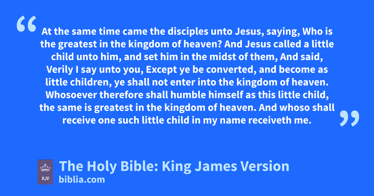 1 At the same time came the disciples unto Jesus, saying, Who is the greatest in the kingdom of heaven? 2 And Jesus called a little child unto him, and set him in the midst of them, 3 And said, Verily I say unto you, Except ye be converted, and become as little children, ye shall not enter into the kingdom of heaven. 4 Whosoever therefore shall humble himself as this little child, the same is greatest in the kingdom of heaven. 5 And whoso shall receive one such little child in my name receiveth me. 6 But whoso shall offend one of these little ones which believe in me, it were better for him that a millstone were hanged about his neck, and that he were drowned in the depth of the sea.